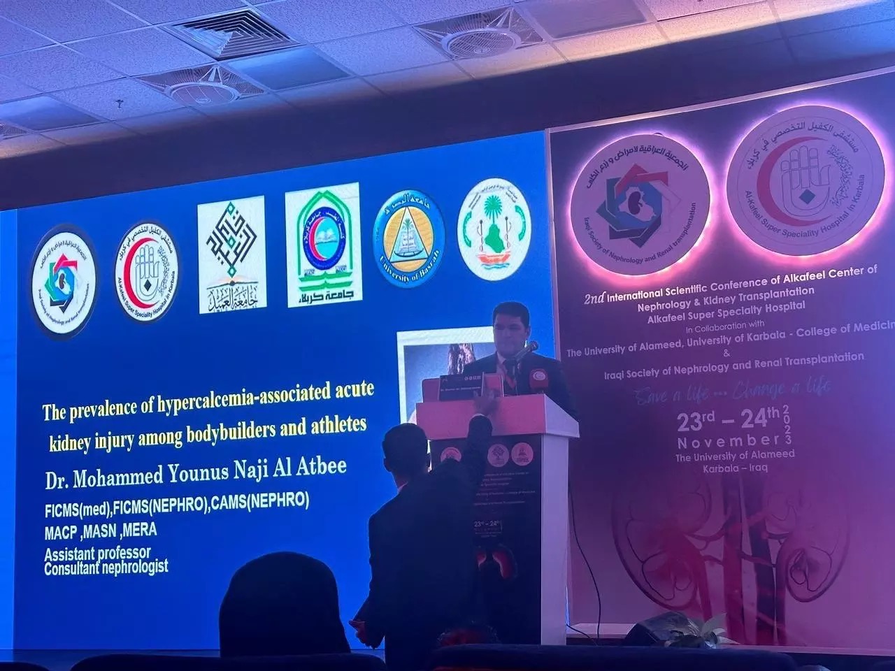 The Assistant Dean for Administrative Affairs at the College of Medicine at the University of Basra, Dr. Muhammad Younis Al-Atbi, participated in the Al-Kafeel International Conference at Al-Ameed University in Karbala. The participation included presenting research on the prevalence of acute kidney failure associated with hypercalcemia among bodybuilders and athletes.