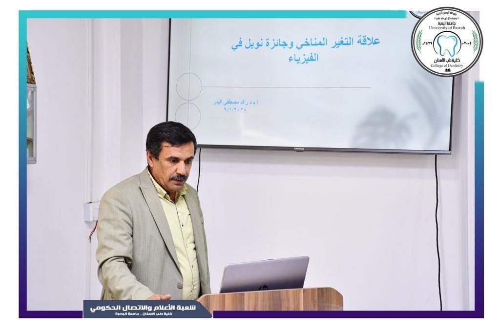 College of Dentistry at the University of Basrah held a scientific symposium entitled The relationship between climate change and the Nobel Prize in Physics. Climate change is considered the decisive issue of our time, and we are now facing a decisive moment. The lecturer, Assistant Professor Dr. Rafid Mustafa Badr, pointed to the global impacts of climate change, which are widespread and unprecedented in size, from changing weather patterns that threaten food production, and to shed light on the models that scientists have used to contribute to understanding climate change and the factors directly affecting it. And indirect. Among the lectures, complex systems are characterized by randomness and chaos, as well as difficulty in understanding, but the Nobel Prize in 2021 crowned the efforts of scientists who invented new ways to describe these systems and predict their behavior in the long term. The Nobel Prize in Physics in 2021 was awarded to three scientists: the Japanese Syokuro Manabe (90 years old), the German Klaus Hasselmann (89 years old), and the Italian Giorgio Baresi (73 years old), in recognition of their scientific contributions to the study of climate change. One of the complex systems of vital importance to humanity is the climate. Earth. The Italian scientist received half the prize for “discovering the interaction of chaos and fluctuations in physical systems from atomic to planetary scales,” which are hidden patterns in complex, disordered matter. His discoveries are considered among the most important contributions to the theory of complex systems. As for the other two scientists, they received the award for their work on “developing computer models of the Earth’s climate that can predict the effect of global warming.” Syokoro Manabe’s efforts focused on showing how increasing levels of carbon dioxide in the atmosphere lead to increased temperatures on the Earth’s surface.