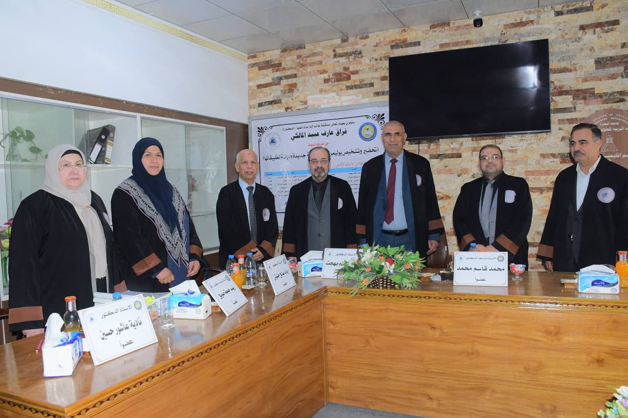 شاركت الدكتوره زينب جمعة صويح التدريسية في مركز ابحاث البوليمر / جامعة البصرة في عضوية لجنة مناقشة اطروحة طالب الدكتوراه فراق عارف عبيد، والموسومة بعنوان تحضير ودراسة بوليمرات مشتركة جديده ودراسة تطبيقات. حيث قام الباحث بتحضير مجموعة من المونمرات والكوبوليمرات والتي شخصت بتقنيات مختلفة منها مطيافية الاشعة تحت الحمراء FTIR C.H.N و H1-NMR والتي وفرت معلومات دقيقة حول البنية التركيبية .قيمت خواص جميع المواد المحضرة بحساب تركيز المذيلات الحرجة لها CMC باستعمال التوصيلية الكهربائية بهدف فهم سلوكها التجميعي في الاوساط المائية.واظهرت المواد المحضرة قابليتها للاستخدام كعوامل استحلاب او كمركبات فعالة سطحيا. وجرت المناقشةالعلمية وسط اجواء اكاديمية رصينة، اثريت بالملاحظات العلمية التي اسهمت في تعزيزالقيمة العلمية للبحث. وفي ختام المناقشة قررت اللجنة قبول الرسالة بعد اجراء التعديلات المطلوبة متمنين للطالب دوام التوفيق والنجاح في مسيرته العلمية.