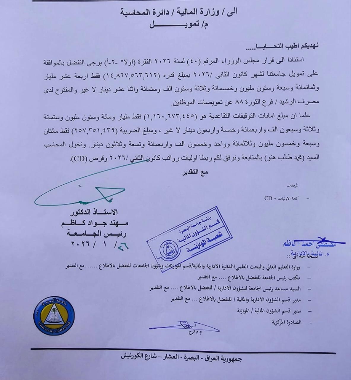 #وقّع رئيس جامعة البصرة، الدكتور مهند جواد كاظم الأسدي، تمويل رواتب منتسبي الجامعة لشهر كانون الثاني 2026 اليوم ، وبشكل كامل ودون أي استقطاع، بعد استحصال الموافقات الأصولية من وزارة المالية / دائرة المحاسبة.