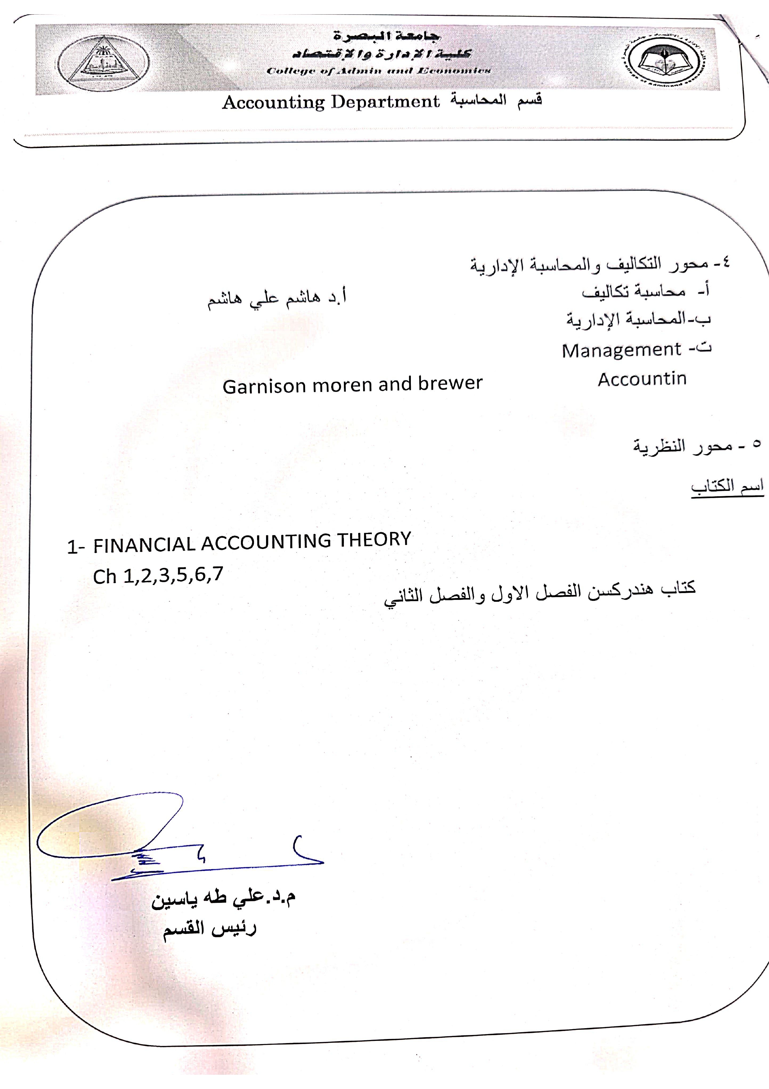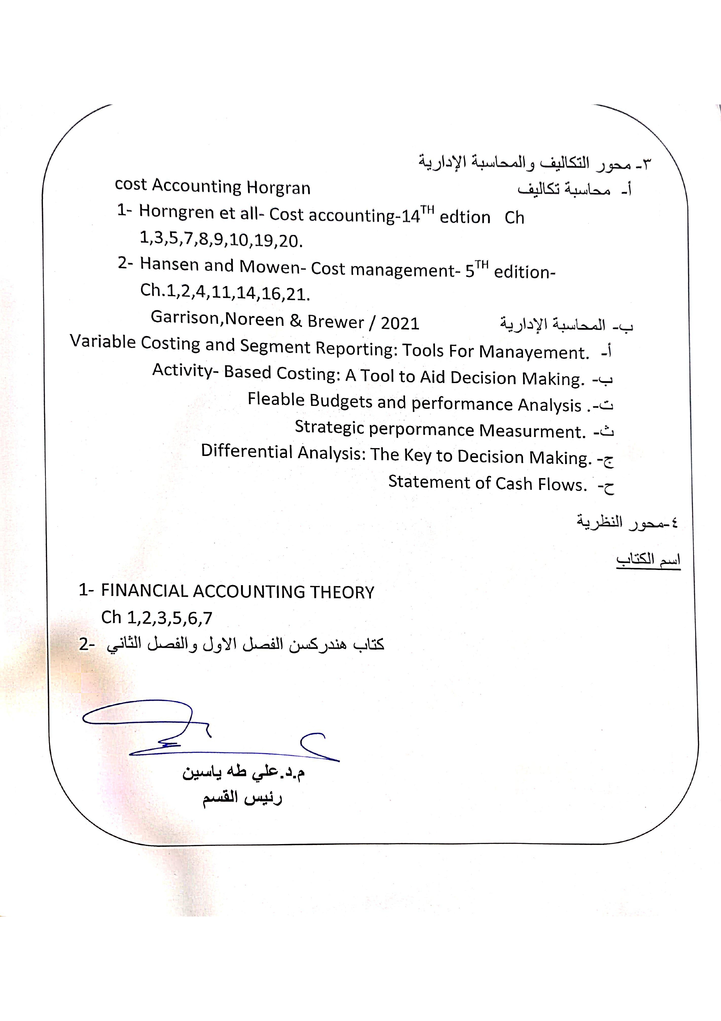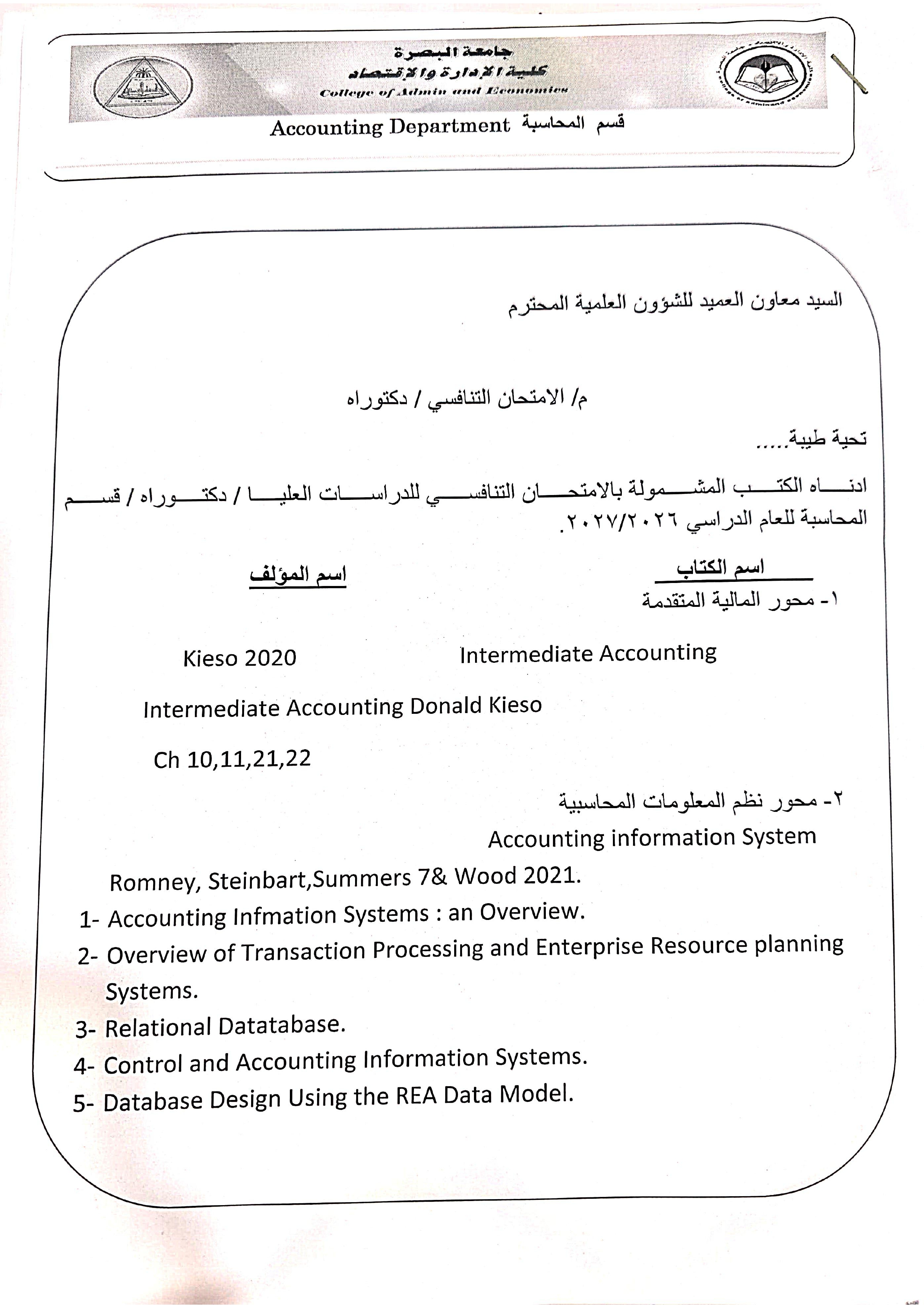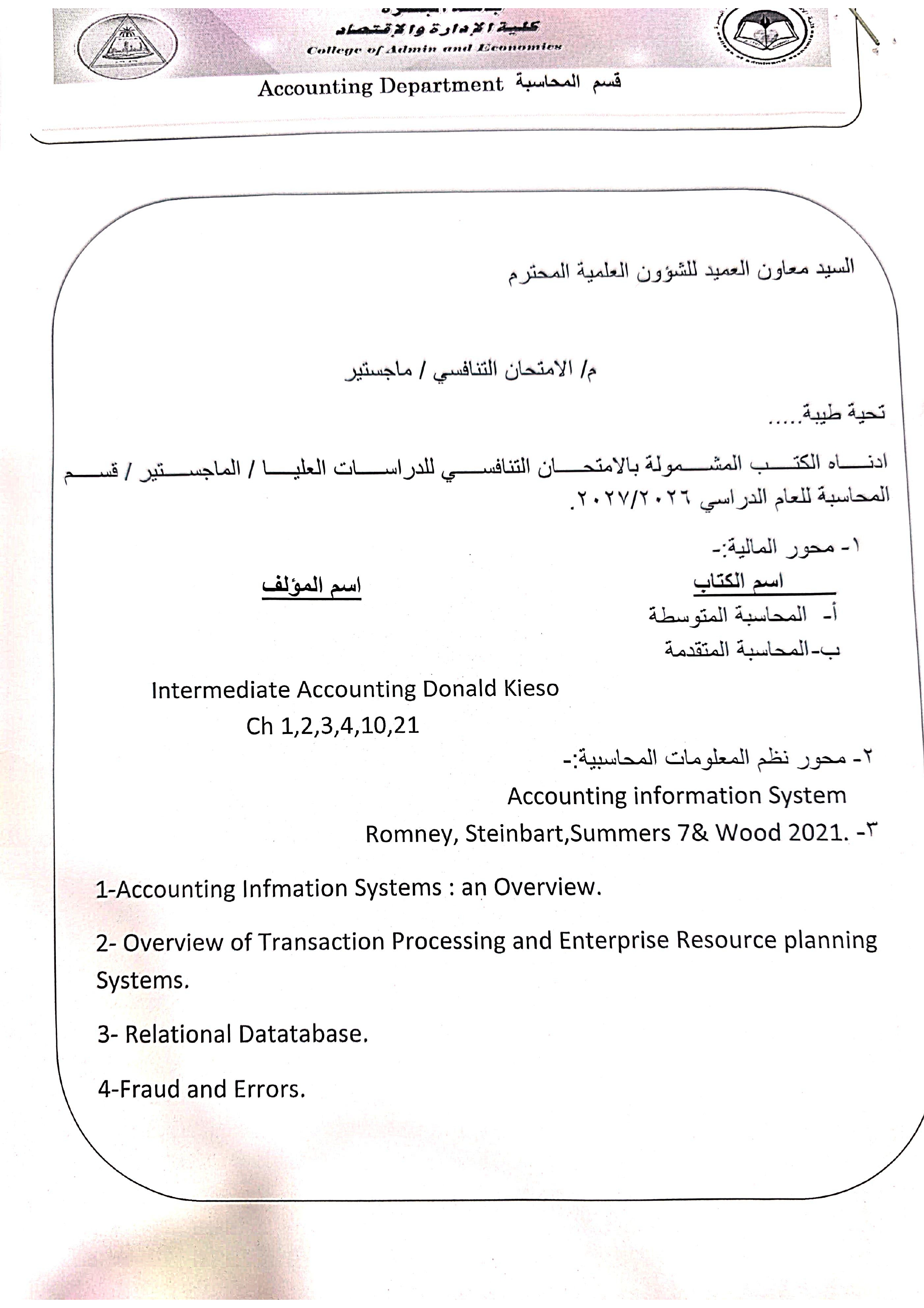 اعلان مواد الامتحان التنافسي للدراسات العليا في قسم المحاسبة للعام الدراسي 2026_2027