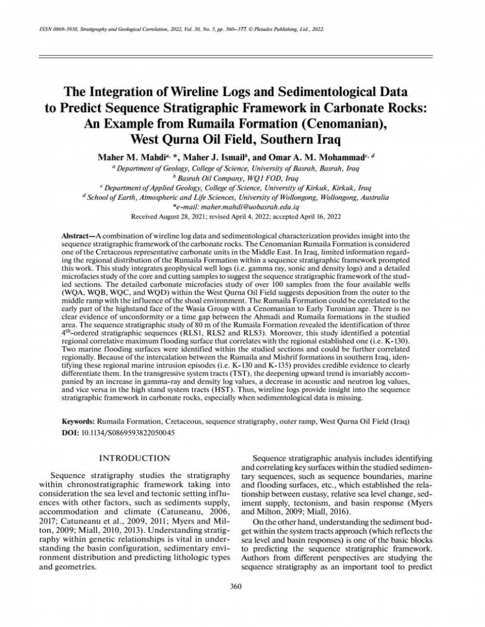 دراسة علمية في جامعة البصرة عن تكامل سجلات الحفر وبيانات الترسبات لتوقع الإطار الطبقي التسلسلي في صخور الكربونات...