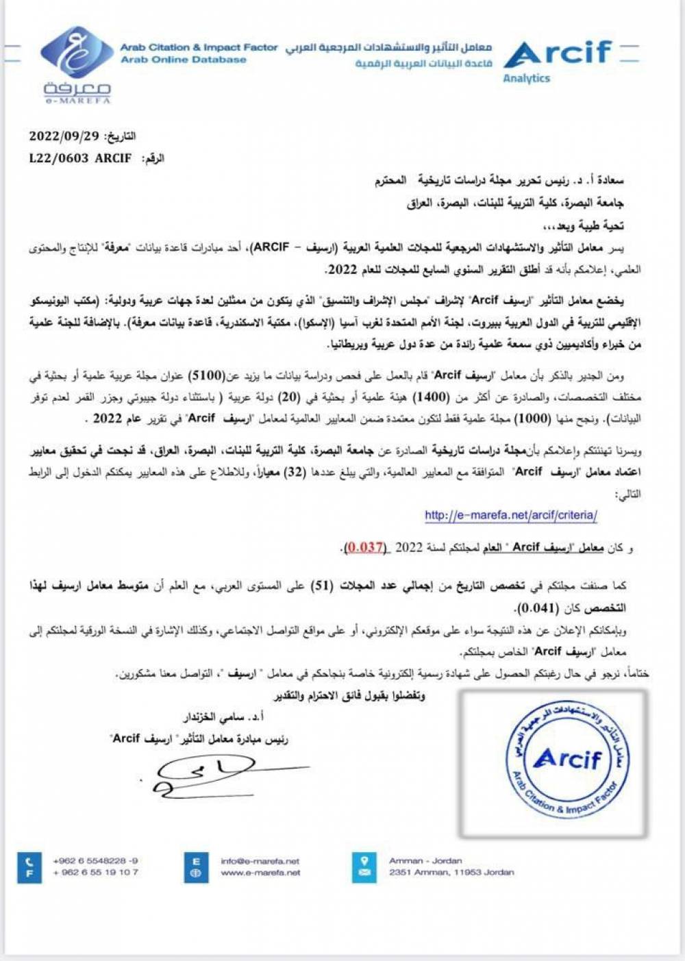 مجلة دراسات تاريخية تحصل على معامـــــــل تأثير (Arcif)...