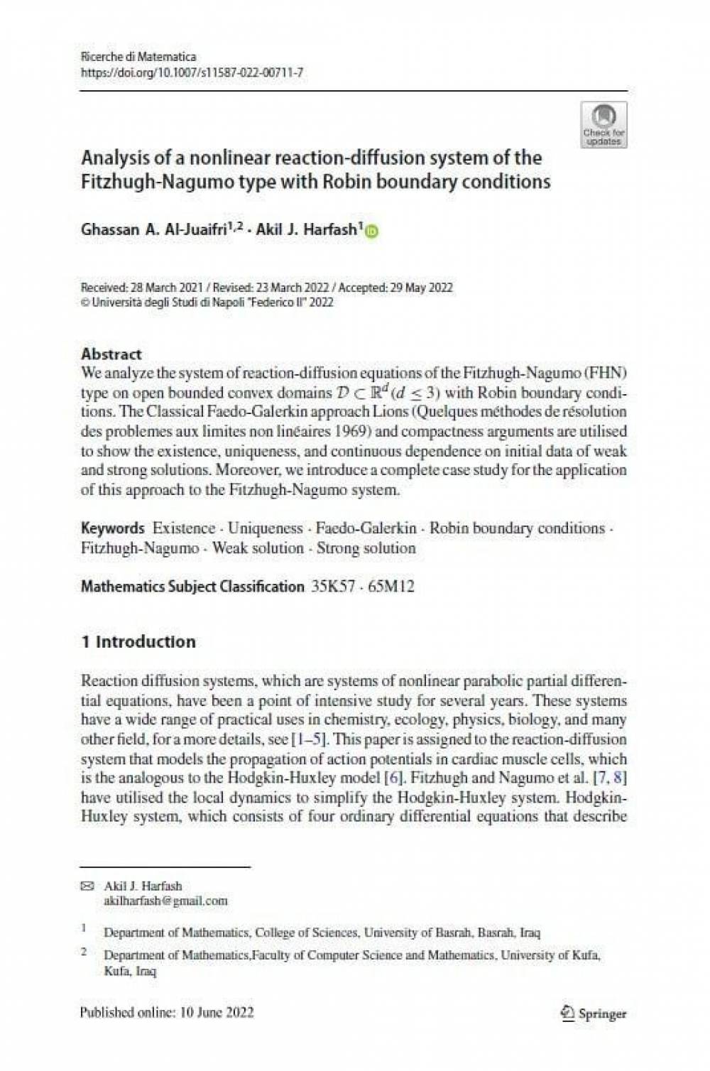 جامعة البصرة تبحث في تحليل نظام الانتشار - التفاعل غير الخطي...