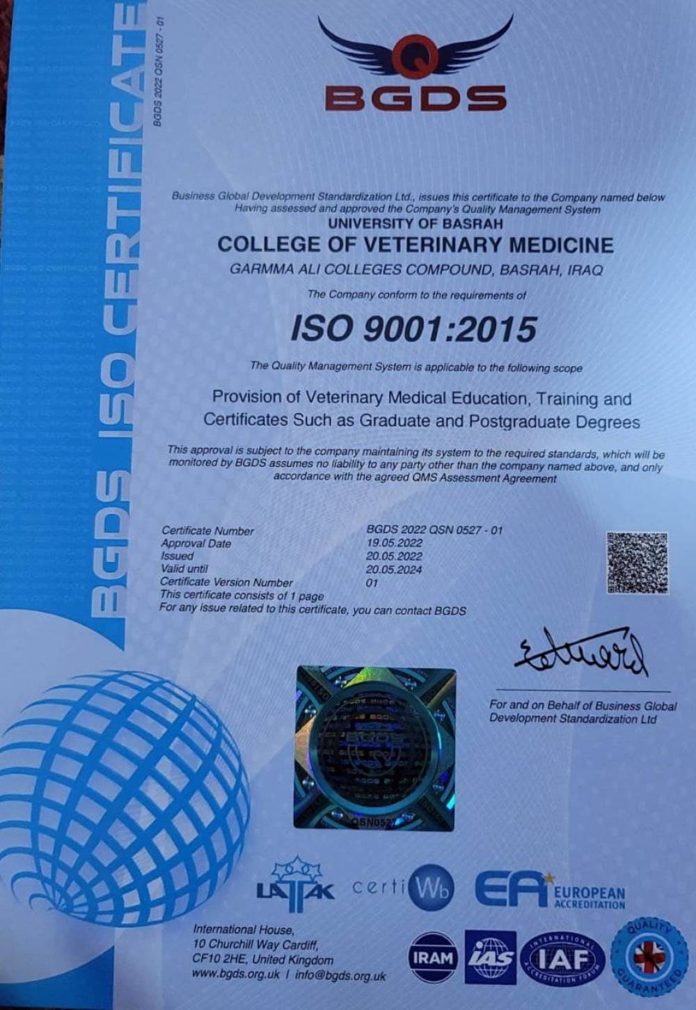 كلية الطب البيطري بجامعة البصرة تحصل على شهادة الآيزو 9001...