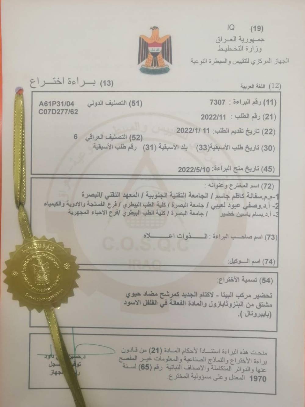 فريق بحثي في جامعة البصرة يحصل على براءة اختراع عن تحضير مركب كمضاد حيوي جديد...