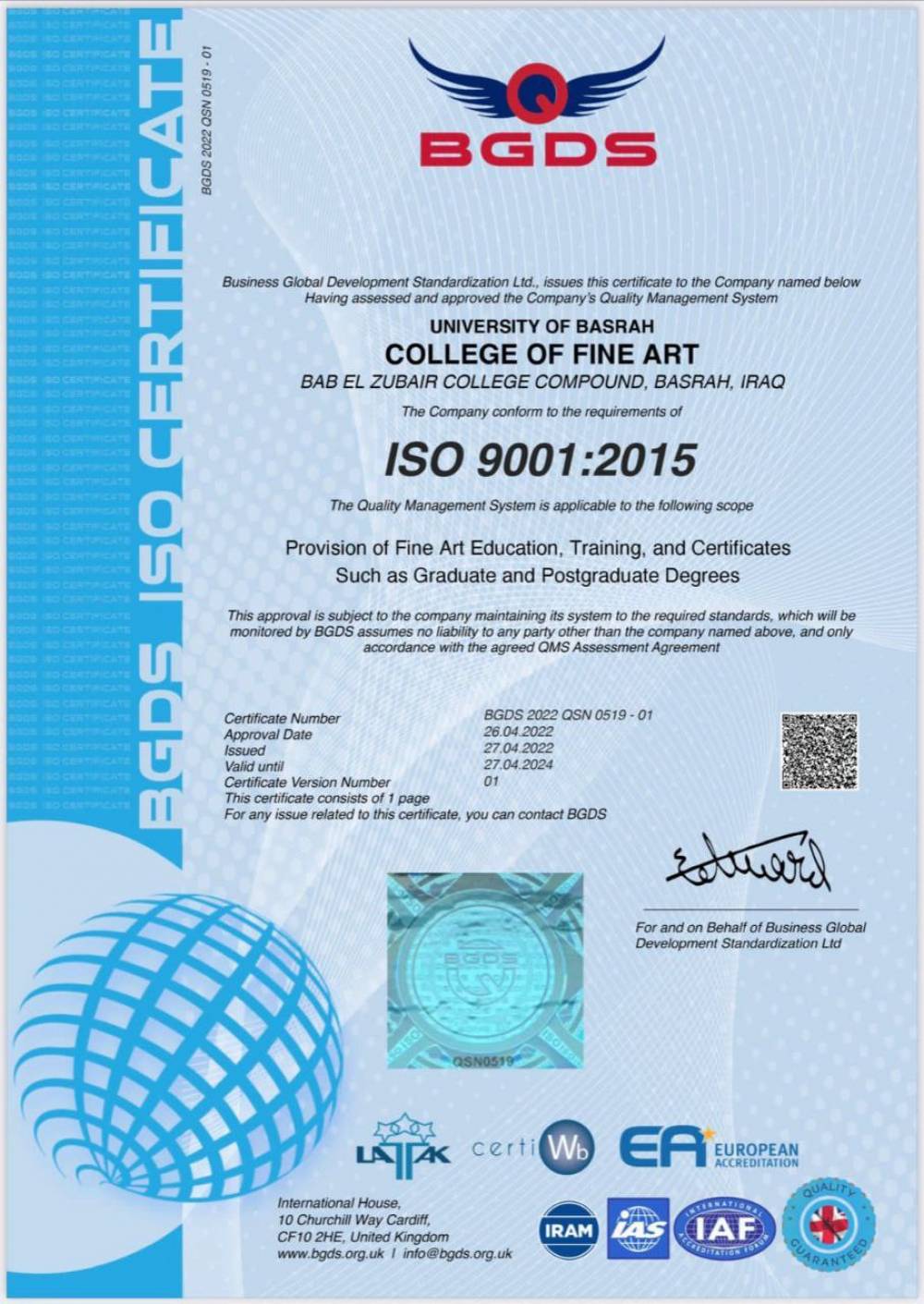 جامعة البصرة تحصل على شهادة الايزو من منظمة BGDS البريطانية...