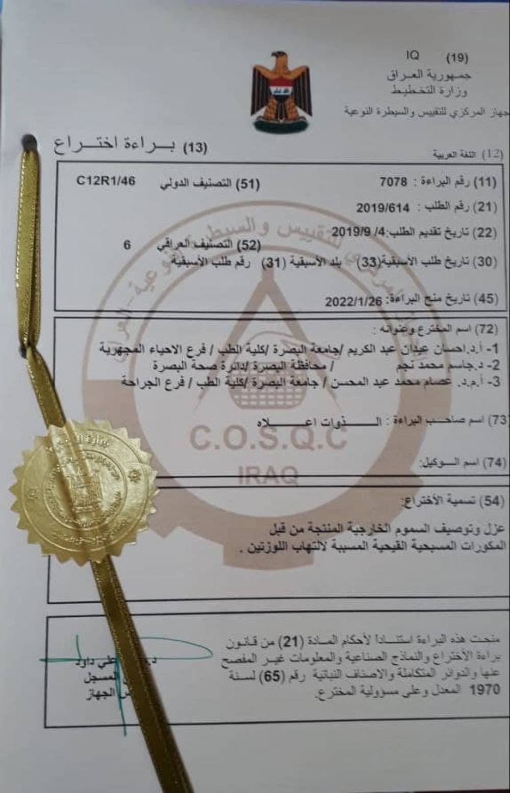 فريق بحثي في جامعة البصرة يحصل على براءة اختراع عن عزل وتوصيف السمـــــــــوم الخارجية...