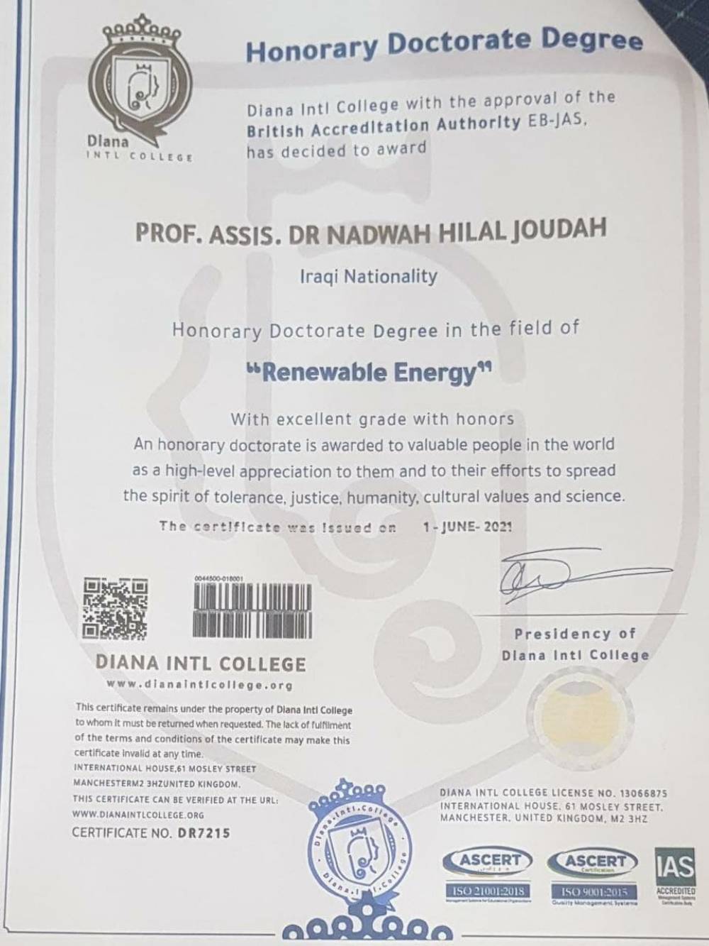 حصول تدريسية في جامعة البصرة على شهادة الدكتوراه الفخرية...