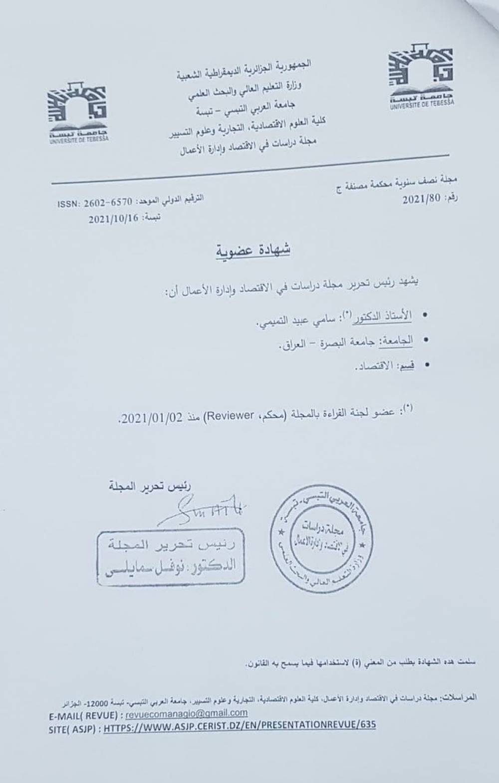 اختيار تدريسي في جامعة البصرة مقوما علميا لمجلة جزائرية...