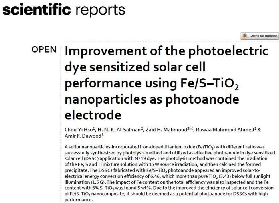 وهدف البحث هو تحسين الكفاءة في تحويل الخلايا الشمسية لمركب النانو Fe/S–TiO2، لذلك ينبغي اعتباره بمثابة قطب ضوئي محتمل لخلايا DSSCs ذات الأداء العالي.