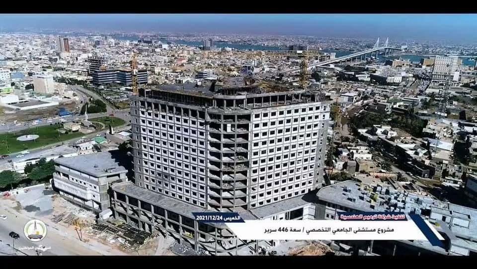 وذكر شاهين تم اكمال الهيكل العام للبناء بارتفاع بلغ (70) متراً مع عمل مهبط لمروحيات الطوارئ الطبية وفق احدث المواصفات العالمية وبذلك تعتبر البناية الاعلى في محافظة البصرة والمستشفى هى الاكبر باحتواءها على (446) سرير.