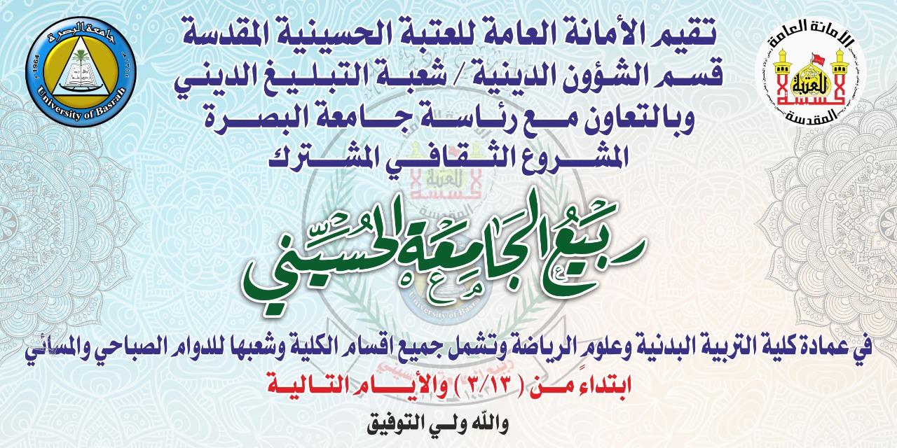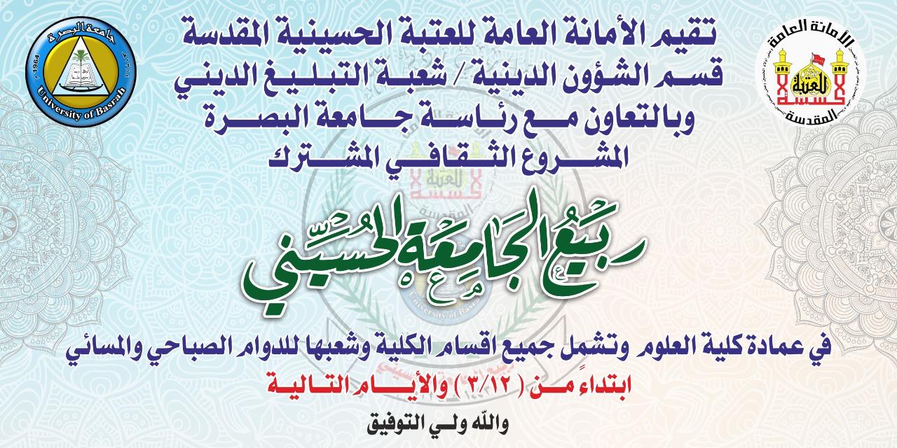 تقيم الامانة العامة للعتبة الحسينية المقدسة وبالتعاون مع جامعة البصرة المشروع الثقافي (ربيع الجامعة الحسيني) في كليات الجامعة وحسب المواعيد المثبتة في البوسترات كمرحلة اولى