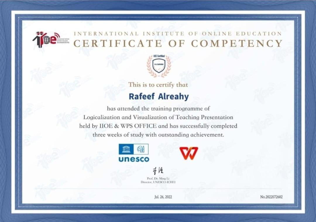 حصلت تدريسية في كلية التربية للبنات بجامعة البصرة على شهادة كفاءة التعليم من المعهد الدولي للتعليم التابع لليونيسكو في دولة الصين.
