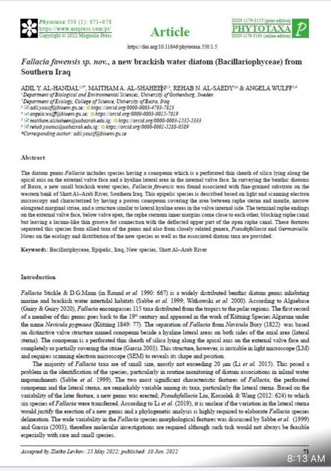 وبينت الدراسة التي تم نشرها في مجلة "Phytotaxa "المصنفة ضمن مستوعبات سكوبس Q3 ان النوع الجديد اطلق عليه تسمية " Fallacia fawensis "من الدياتومات الصغيرة.