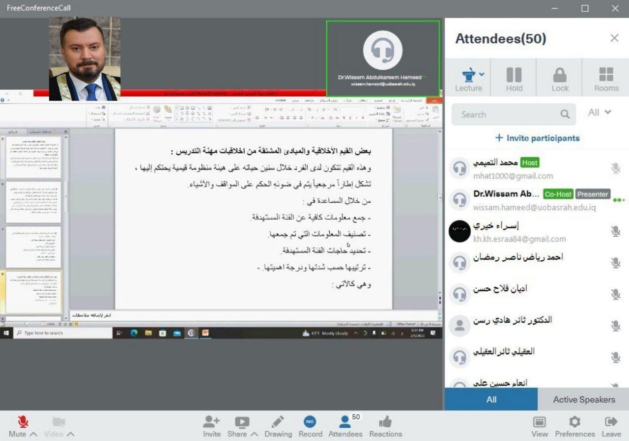 نظم مركز التطوير والتعليم المستمر في جامعة البصرة محاضرة عن اخلاقيات مهنة التدريس عبر الانترنت .