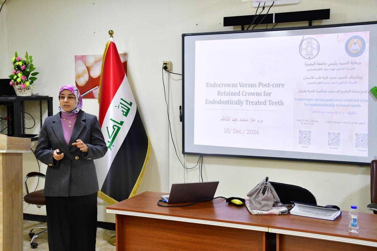 نظمت كلية طب الأسنان في جامعة البصرة محاضرة عن استخدام التغليف الجزئي للاسنان الخلفية بدلا من التغليف الكلي أو تدعيم الحشوات النهائية باوتاد خاصة.