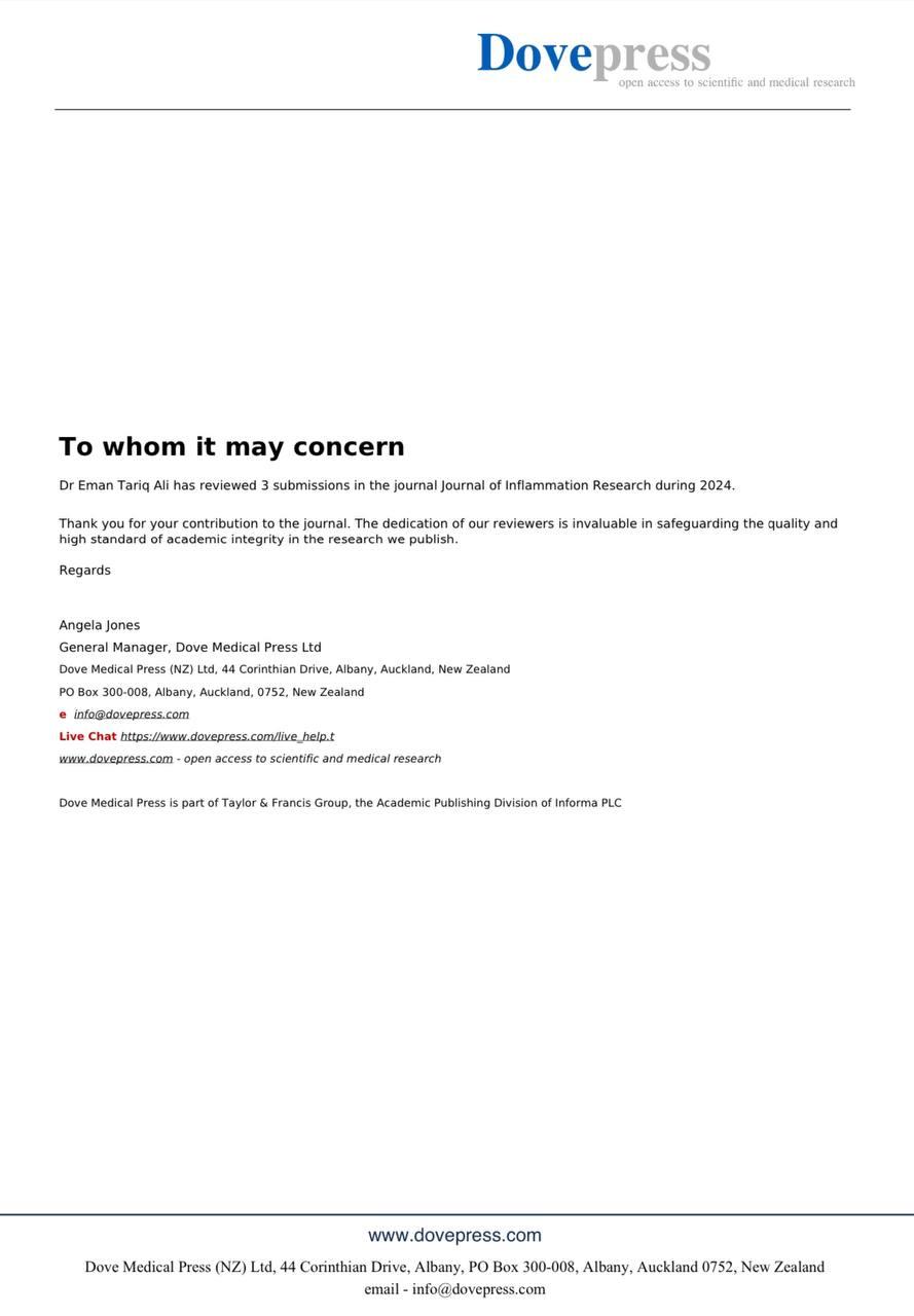 اختيرت التدريسية في كلية الصيدلة بجامعة البصرة الدكتور ايمان طارق علي الاحمد مقيماً علمياً لمجلة Journal of Inflammation Research وضمن تصنيف كلاريفيت و سكوباس ذات معامل تأثير 4.6 وسايت سكور 6.5