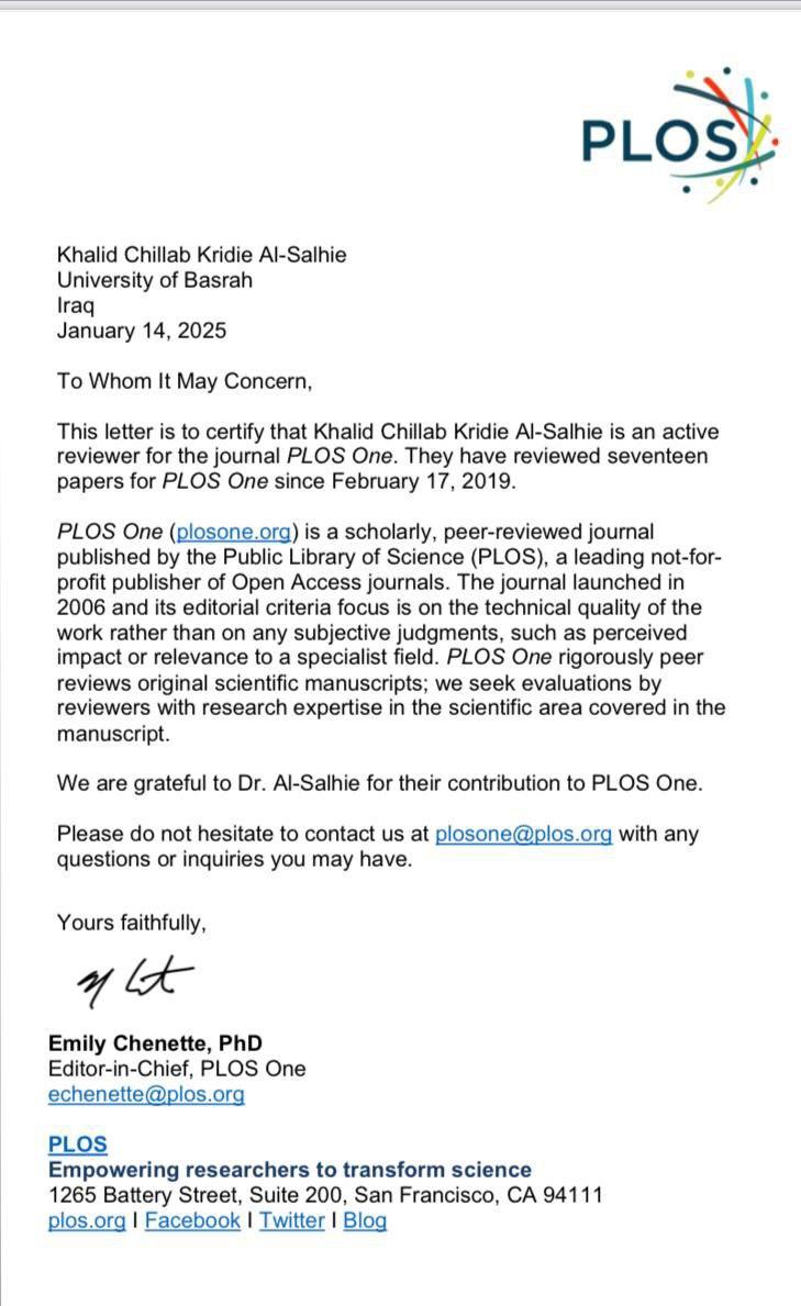 اُختير الدكتور خالد جلاب كريدي الصالحي التدريسي في كلية الزراعة بجامعة البصرة كمقيم علمي معتمد وحصوله على شهادة تقديرية من مجلة بلوس ون PLoS ONE الامريكية التي تصدر عن المكتبة العامة للعلوم نتيجة لتقييمه 17 بحثاً علمياً قدمت الى المجلة لغرض النشر فيها.