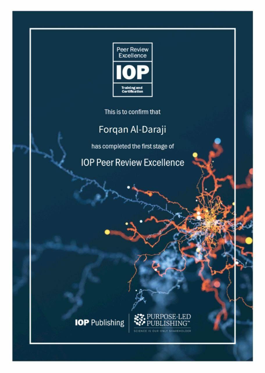 وجاء هذا التكريم بعد اجتيازه اختبارات دورة تدريبية متخصصة وتقييمه لبحث علمي في إحدى المجلات التابعة لـ IOP، ما يعكس تميزه في مجال التقييم العلمي والتحكيم الأكاديمي.