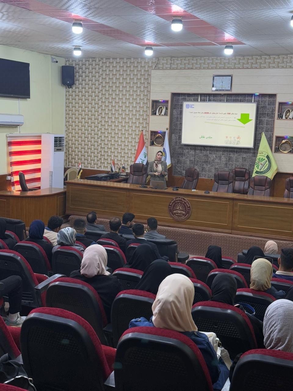 وتضمنت المحاضرة التي القتها التدريسية سارة سالم توضيح قطاعات الاقتصاد الاخضر والمهن الخضراء وتشجيع التعاون بين الحكومات والقطاع الخاص والمجتمع المدني لتعزيز فرص العمل واهمية دعم رواد الأعمال والمشاريع الصغيرة التي تساهم في الاستدامة البيئية.