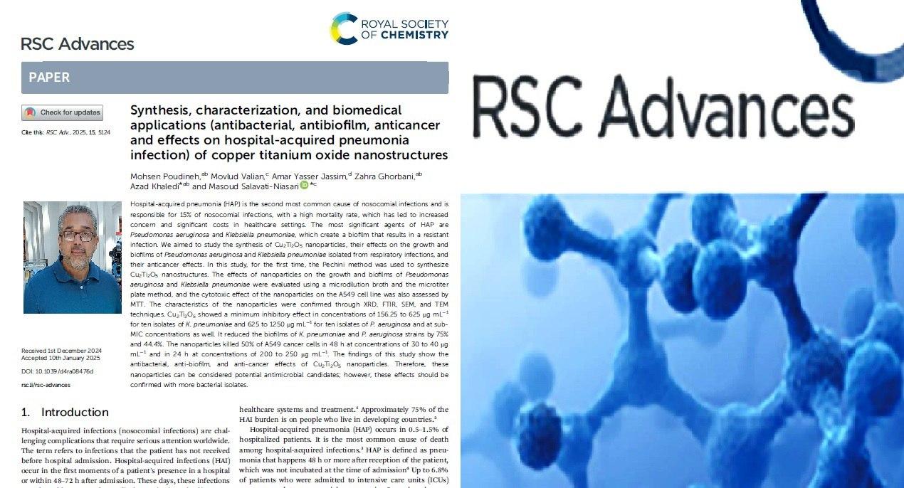 نشر التدريسي في مركز علوم البحار بجامعة البصرة الدكتور عمار ياسر جاسم بحثاً علمياً بالتعاون مع باحثين اخرين بعنوان " تخليق وتوصيف المواد النانوية لأكاسيد نحاس التيتانيوم وتقييم تطبيقاتها الطبية الحيوية المتعددة لاستخدامها كمضاد للبكتيريا والأغشية الحيوية والسرطان والالتهاب الرئوي المكتسب من المستشفى" في مجلة ( RSC Advances ) الصادرة عن دار النشر ( Royal Society of Chemistry ) .