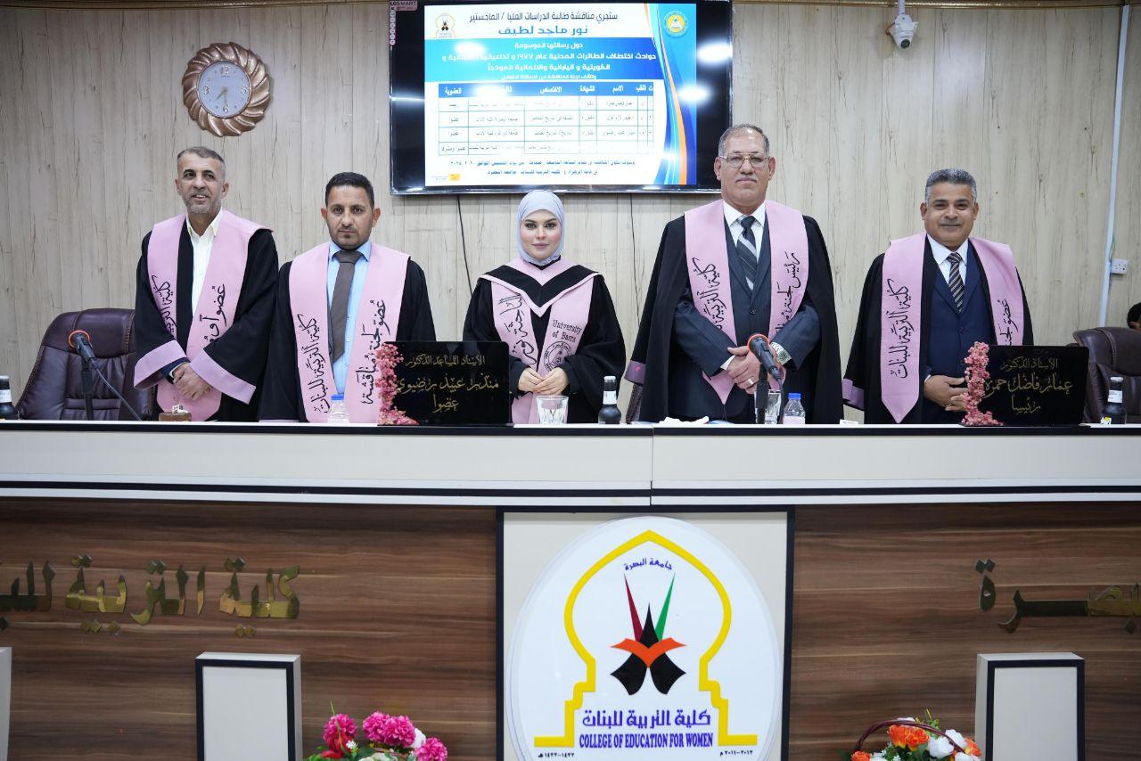 بحثت رسالة ماجستير في كلية التربية للبنات بجامعة البصرة “حوادث اختطاف الطائرات عام 1977 وتداعياتها (اللبنانية، الكويتية، اليابانية، الألمانية) أنموذجًا”.