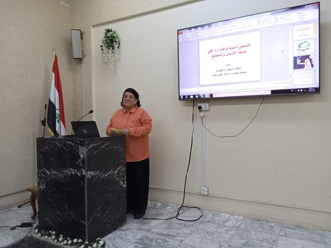 نظم مركز علوم البحار في جامعة البصرة محاضرة توعوية بعنوان “ التدخين أسبابه واضراره على صحة الإنسان والمجتمع ".