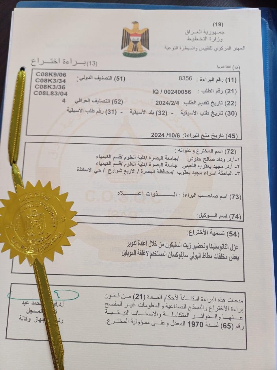 تدريسيان في جامعة البصرة ينشران براءة اختراع عن إعادة تدوير زيت السيليكون.