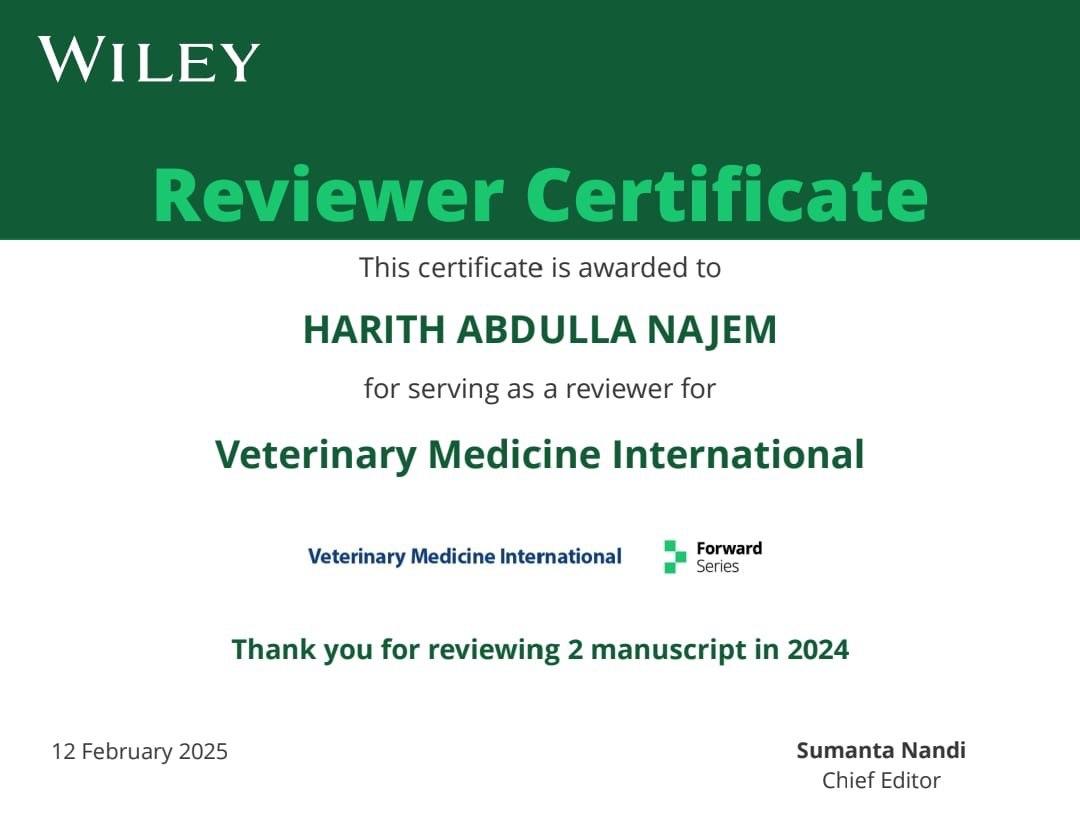 اختير التدريسي في كلية الطب البيطري بجامعة البصرة الدكتور حارث عبد الله نجم مقيماً علمياً لمجلة Veterinary Medicine International المصنفة في سكوباس الربع الاول cite score 3.5