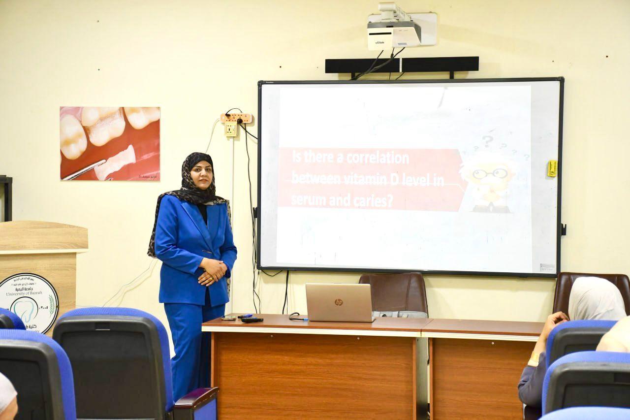 وتضمنت الورشة محاضرة قدمتها التدريسية في الكلية الدكتورة هيام صلاح احمد بيان نقص فيتامين(D) وتأثيره على صحة الفم والاسنان لدى الاطفال حيث يزيد من احتمالية تسوس الأسنان، ضعف مينا الأسنان، وتأخر نمو الأسنان.