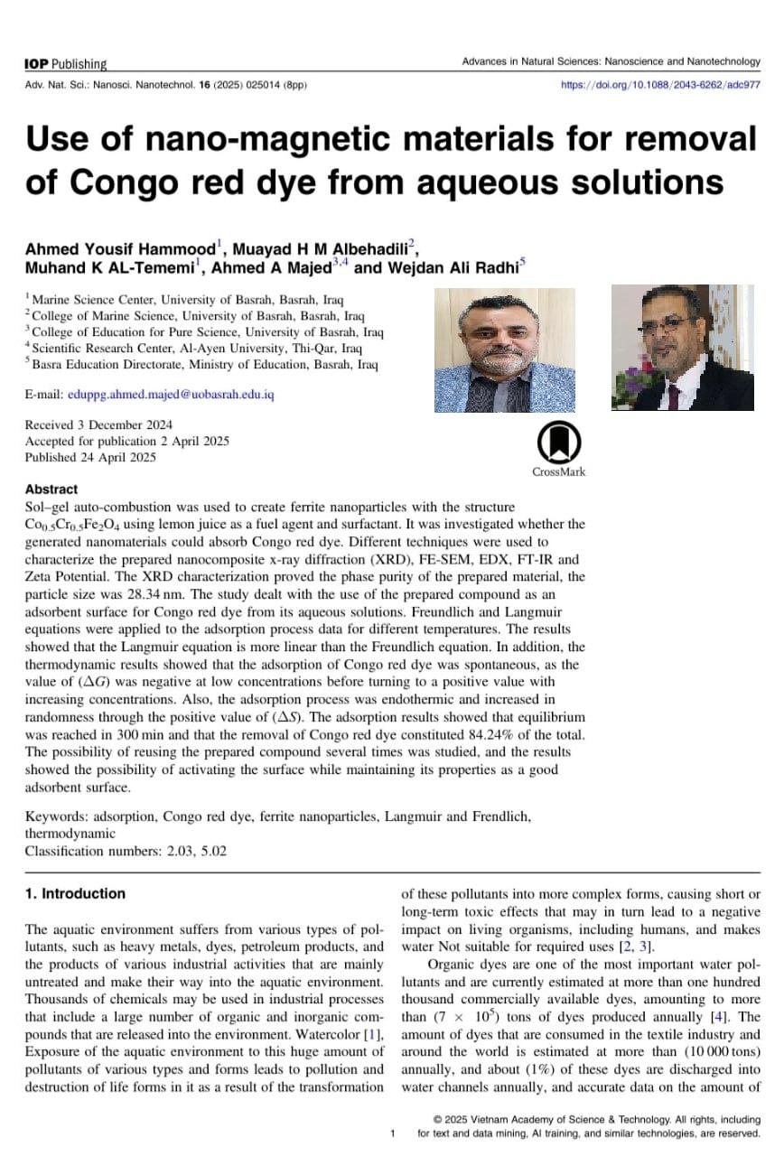 نشر التدريسيان في مركز علوم البحار بجامعة البصرة الدكتور احمد يوسف حمود والدكتور مهند كاظم طاهر بحثاً علمياً بالتعاون مع باحثين اخرين بعنوان " استخدام المواد المغناطيسية النانوية لإزالة صبغة الكونغو الحمراء من المحاليل المائية " في مجلة ( Advences in Natural Sciences ) الصادرة عن دار النشر ( IOP ) البريطانية .