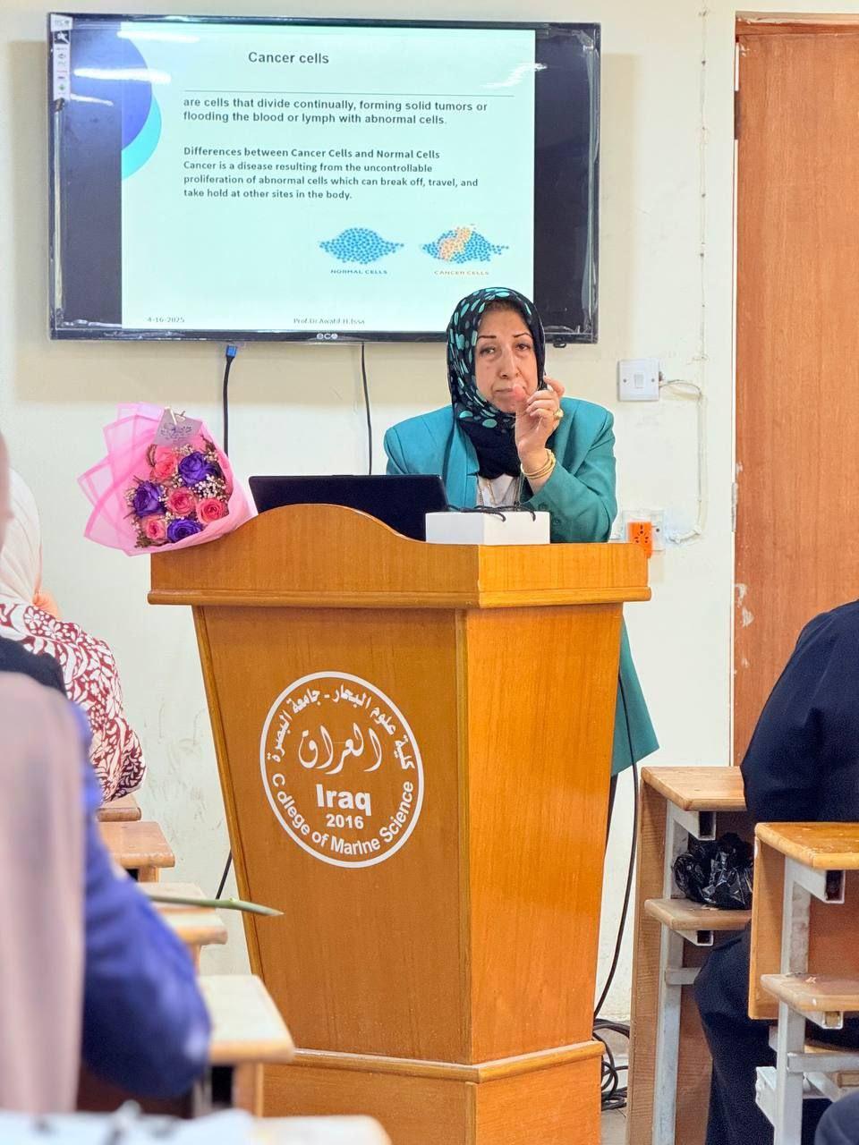 نظمت كلية علوم البحار في جامعة البصرة، ندوة توعوية بعنوان "المؤشرات البيوكيميائية السرطانية وأهميتها المختبرية"، وذلك ضمن الأنشطة العلمية والتوعوية التي تسعى الكلية إلى تنظيمها لتعزيز الثقافة الصحية لدى الطلبة والمنتسبين.