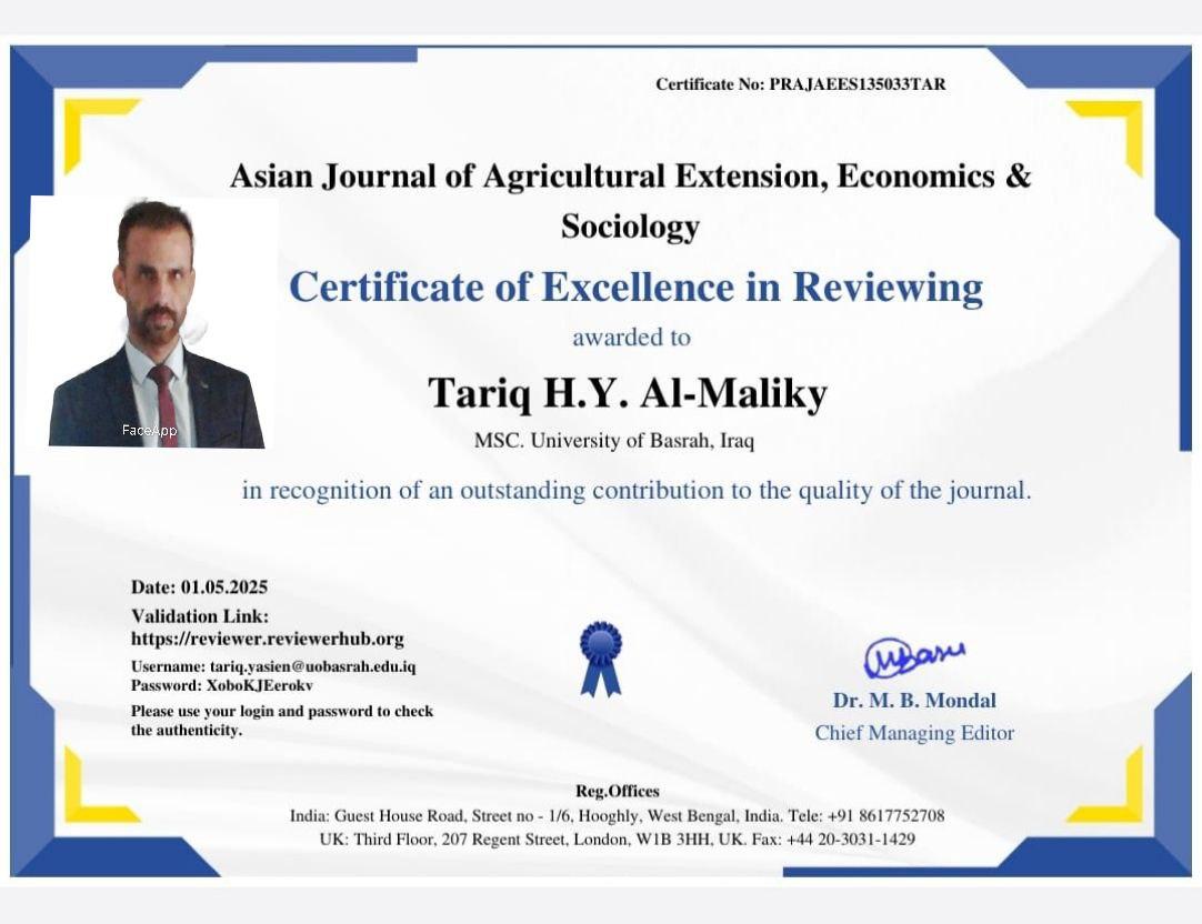 اختير التدريسي في مركز علوم البحار بجامعة البصرة، الدكتور طارق حطاب ياسين، مقيماً علمياً في المجلة الآسيوية للإرشاد الزراعي والاقتصاد وعلم الاجتماع (Asian Journal of Agricultural Extension, Economics & Sociology).