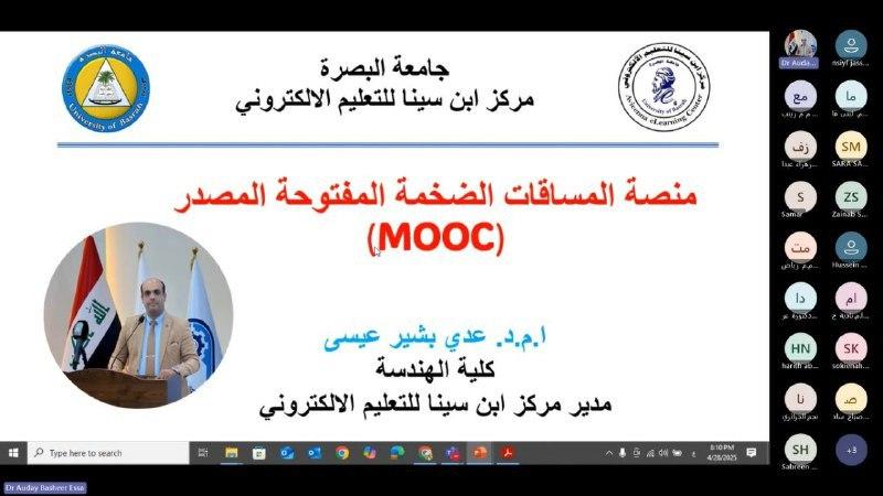 نظم مركز ابن سينا للتعليم الالكتروني ورشة عمل عبر الانترنيت عن منصة مساقات جامعة البصرة الضخمة مفتوحة المصدر ( MOOC ) .