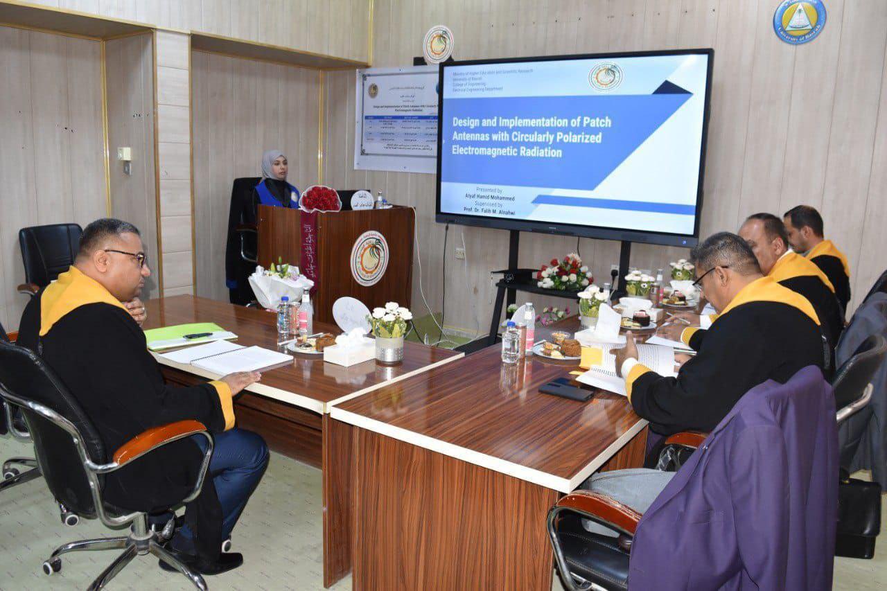 وتهدف الرسالة التي قدمتها الطالبة اطياف حامد محمد الى تصميم وتصنيع (Microstrip Antenna) دائري الاستقطاب مزدوج التغذية مخصص لتطبيقات الجيل الخامس (5G) ضمن حزمة LTE Band 43 (3.6-3.8 GHz).