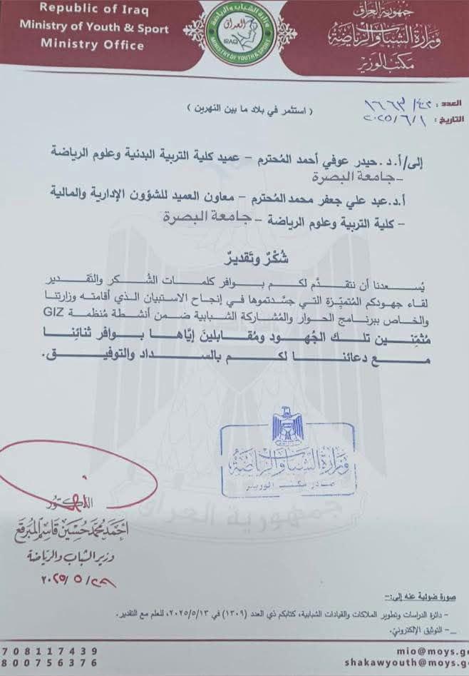 حصل عميد كلية التربية البدنية وعلوم الرياضة في جامعة البصرة الدكتور حيدر عوفي احمد ومعاونه للشؤون الادارية والمالية الدكتور عبد علي جعفر محمد على كتاب شكر وتقدير من وزير الشباب والرياضة.