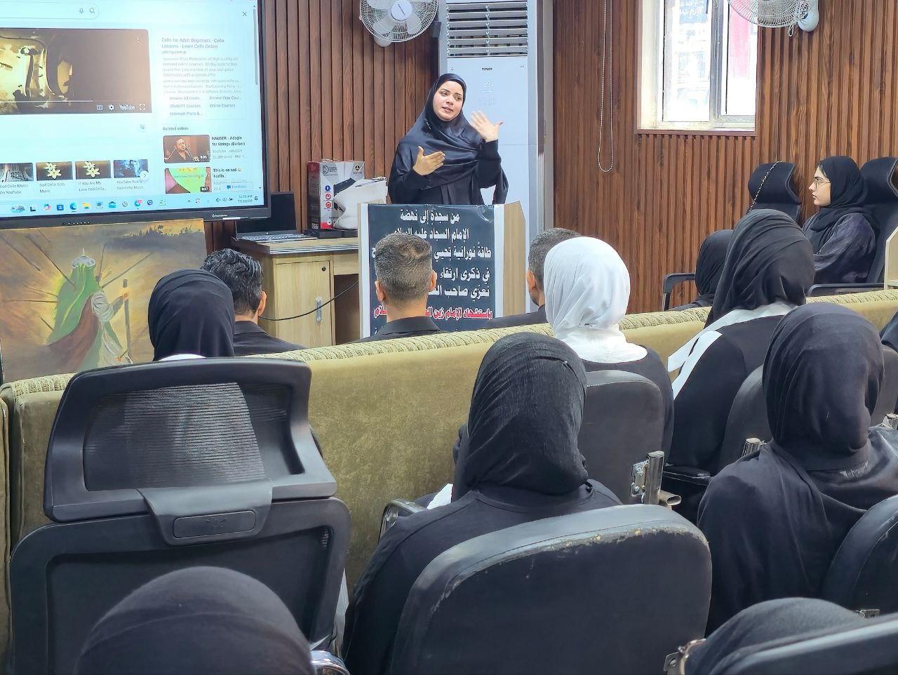 وتضمنت المحاضرة التي قدمتها المحاضرة الطبيبة سمر توفيق عبدالله ، بيان دور الإمام زين العابدين (عليه السلام) في النهضة الفكرية والروحية بعد واقعة كربلاء، وجهوده في ترسيخ قيم الإسلام من خلال الدعاء والعلم.