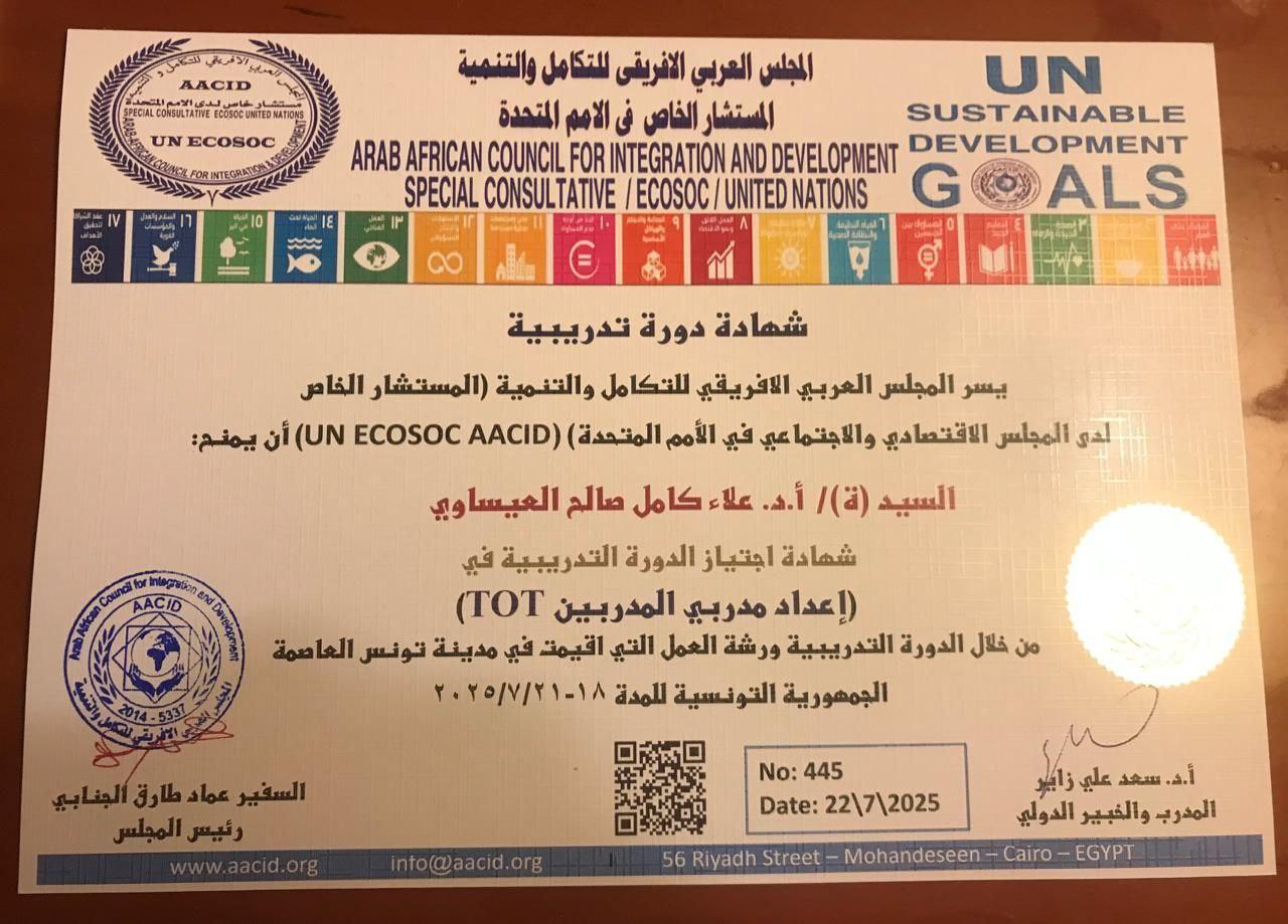 شارك التدريسي في كلية الآداب بجامعة البصرة، الدكتور علاء كامل العيساوي، في الورشة التدريبية الدولية لإعداد المدربين (ToT)، التي أقيمت في دولة تونس، ونظمها المجلس العربي الإفريقي للتكامل والتنمية، بإشراف المستشار الخاص في الأمم المتحدة.