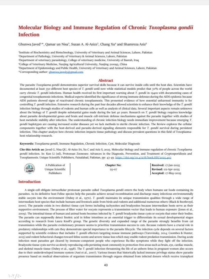 وقد نُشر الفصل في كتاب علمي مرموق بعنوان "protozoan zoonoses: advances in the diagnosis, prevention, and treatment of Cryptosporidiosis and Toxoplasmosis"، الصادر عن دار النشر العالمية "Unique Scientific Publishers".