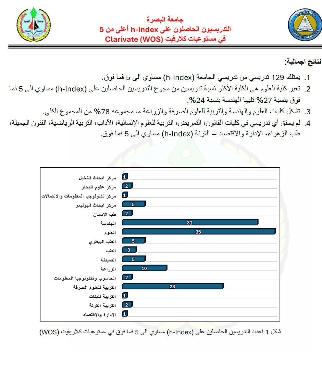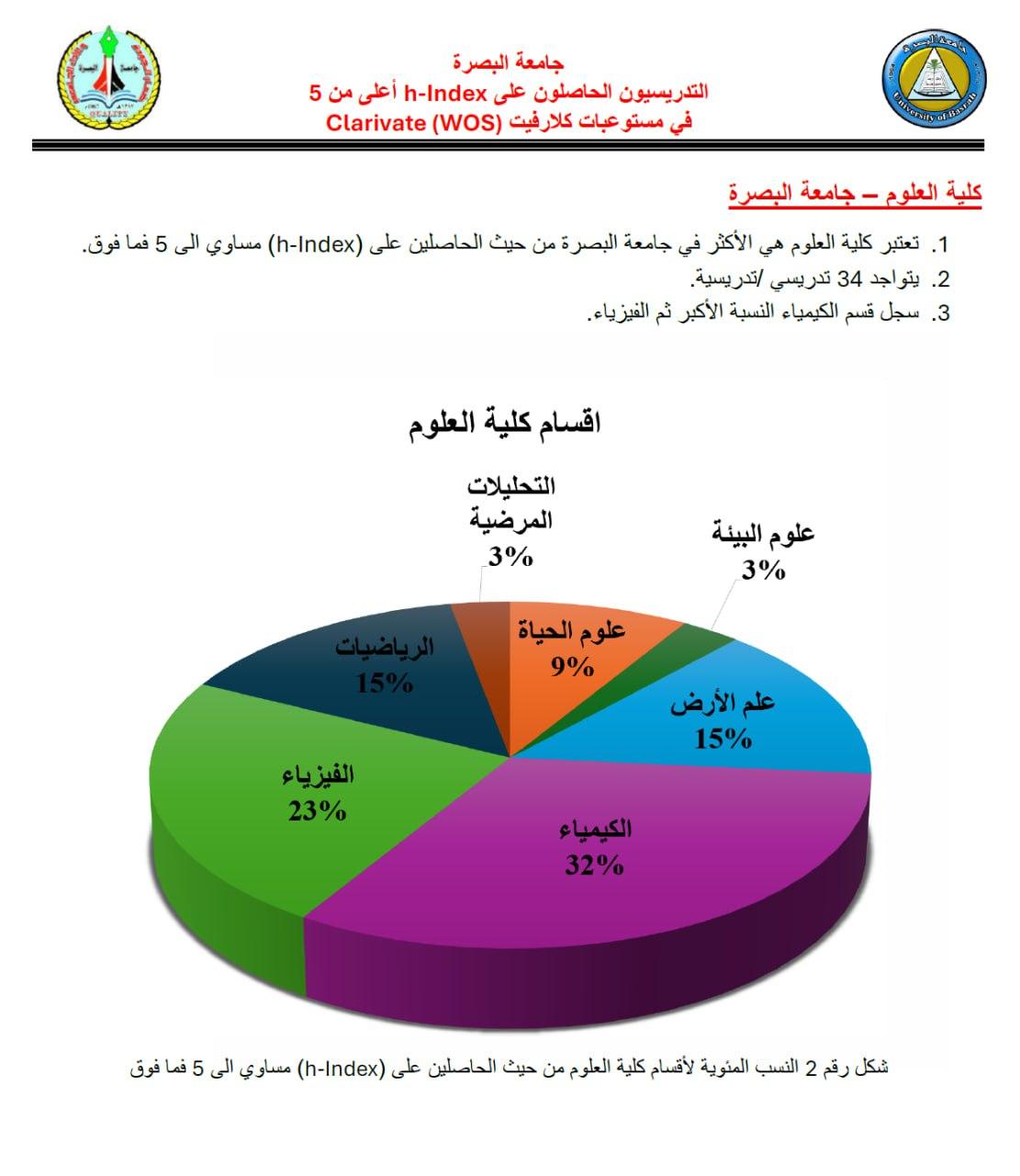 حققت كلية العلوم في جامعة البصرة إنجازاً علمياً متميزاً بتصدرها المركز الأول بين كليات جامعة البصرة في مستوعب كلاريفيت العالمي.