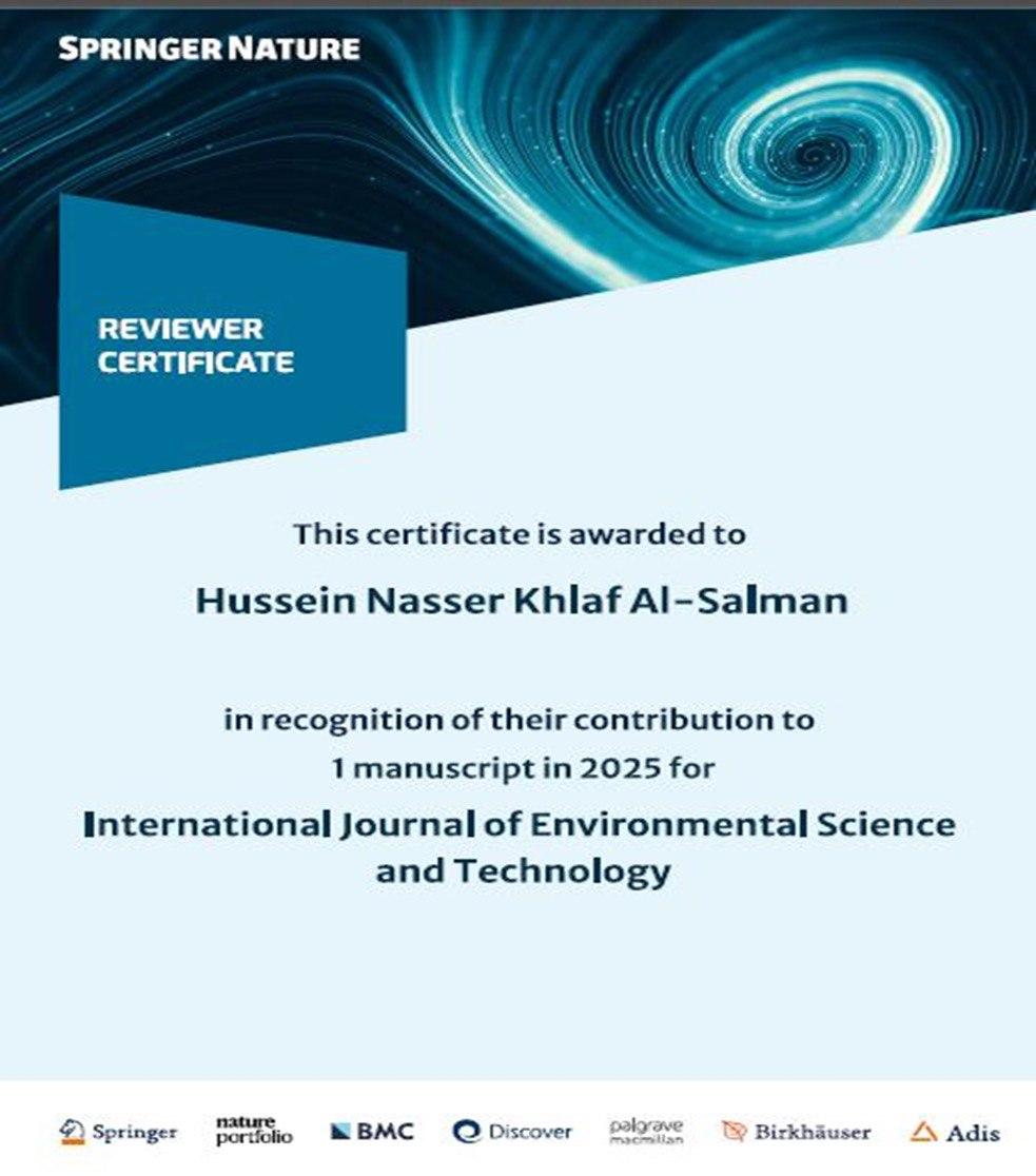 اختير التدريسي في كلية الصيدلة بجامعة البصرة الدكتور حسين ناصر خلف السلمان مقيماً علمياً لمجلة International Journal of Environmental Science and Technology وضمن الربع الأول لتصنيف سكوبس.