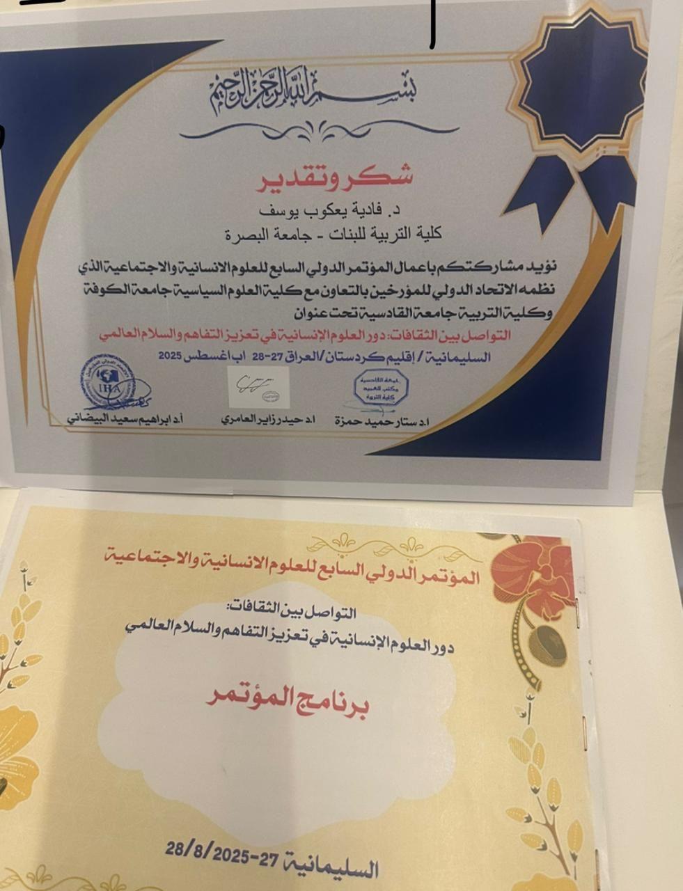 شاركت التدريسية في كلية التربية للبنات بجامعة البصرة الدكتورة فادية يعكوب يوسف في المؤتمر الدولي للمؤرخين lHA الذي نظمهُ الإتحاد الدولي للمؤرخين تحت عنوان "التواصلً بين الثقافات:دور العلوم الإنسانية في تعزيز التفاهم والسلام العالمي" والذي عقد في محافظة السليمانية / اقليم كردستان العراق .