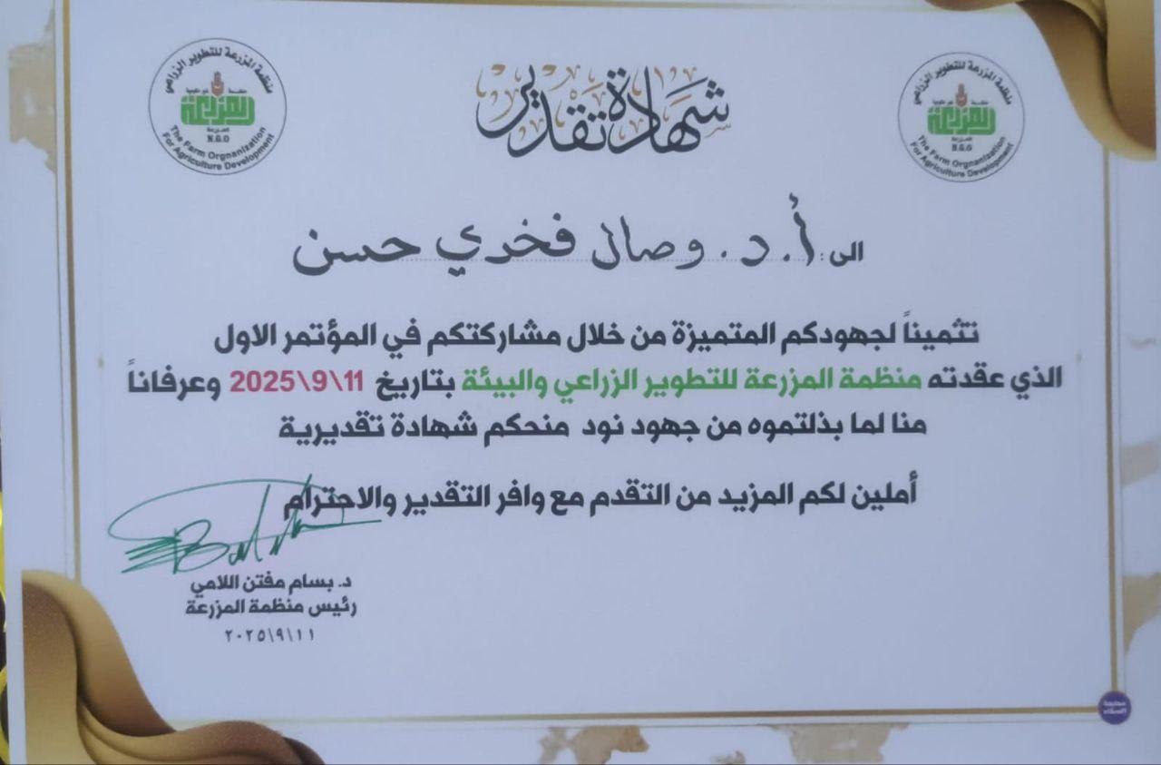 شاركت التدريسية في كلية علوم البحار بجامعة البصرة الدكتورة وصال فخري حسن في أعمال المؤتمر الأول الموسوم "الموارد المائية... أزمة متجددة ومستقبل مجهول"، بالتعاون مع منظمة المزرعة للتطوير الزراعي والبيئة.