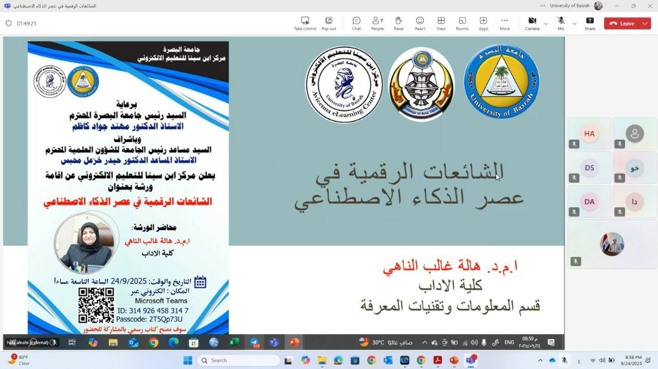 نظم مركز ابن سينا للتعليم الالكتروني بجامعة البصرة ورشة عبر الانترنيت عن الشائعات الرقمية في عصر الذكاء الاصطناعي .