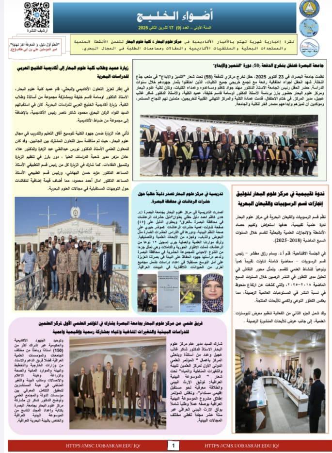 من أجل دعم خطط التنمية المستدامة في الحفاظ على التنوع البحري أصدر مركز علوم البحار وكلية علوم البحار بجامعة البصرة العدد التاسع من النشرة الشهرية " أضواء الخليج ".