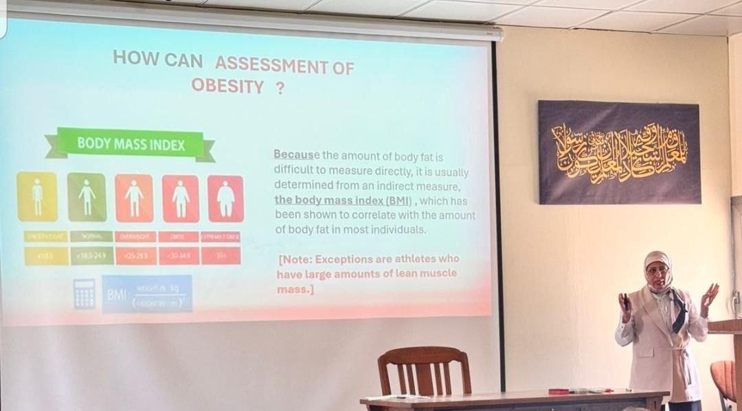 وتضمنت الورشة محاضرة قدمتها التدريسية وصال عبد الرحمن سالم بين خلالها تعريف السمنة وكيف تمثل حالة مرضية تؤدي الى الى الكثير من الاضطرابات والامراض نتيجة لتأثيرها الكبير على مختلف اعضاء الجسم بسبب تراكم الدهون المفرط وخصوصا السمنة المعروفة بالسمنة البطنية وارتفاع مؤشر كتلة الجسم.