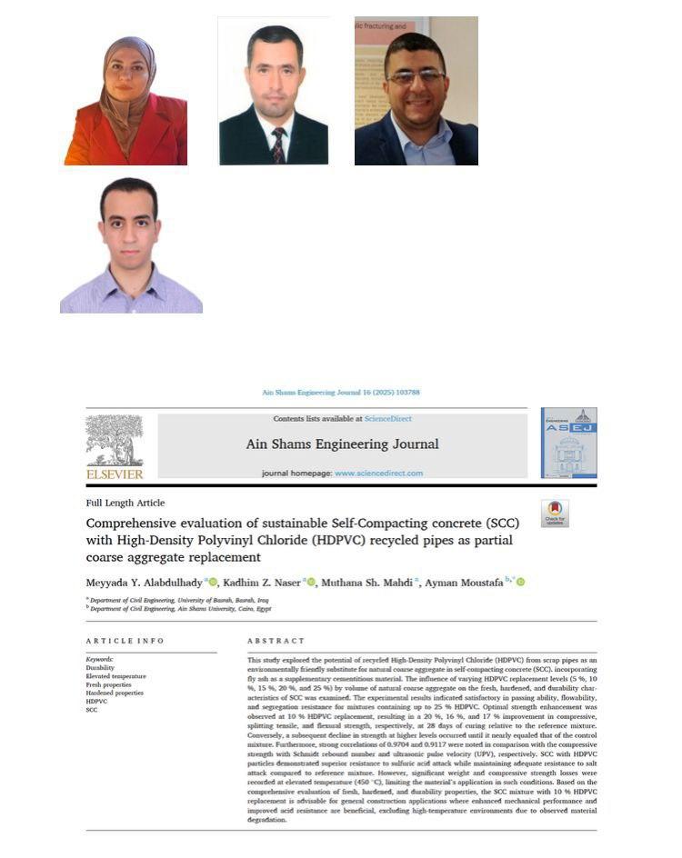 وبيّنت الدراسة التي نُشرت في مجلة (Ain Shams Engineering Journal) التابعة لدار النشر (Elsevier) الإمكانات الكامنة في كلوريد البولي فينيل عالي الكثافة المعاد تدويره والمستخلص من أنابيب الخردة كبديل صديق للبيئة للركام الخشن الطبيعي في الخرسانة ذاتية الدمك مع دمج الرماد المتطاير كمادة أسمنتية تكميلية لتقديم حل عملي مزدوج الفائدة لتنظيف البيئة من النفايات البلاستيكية، وإنشاء مواد بناء خضراء وفعالة ومستدامة، مما يدعم التحول نحو صناعة تشييد مسؤولة بيئيًا.