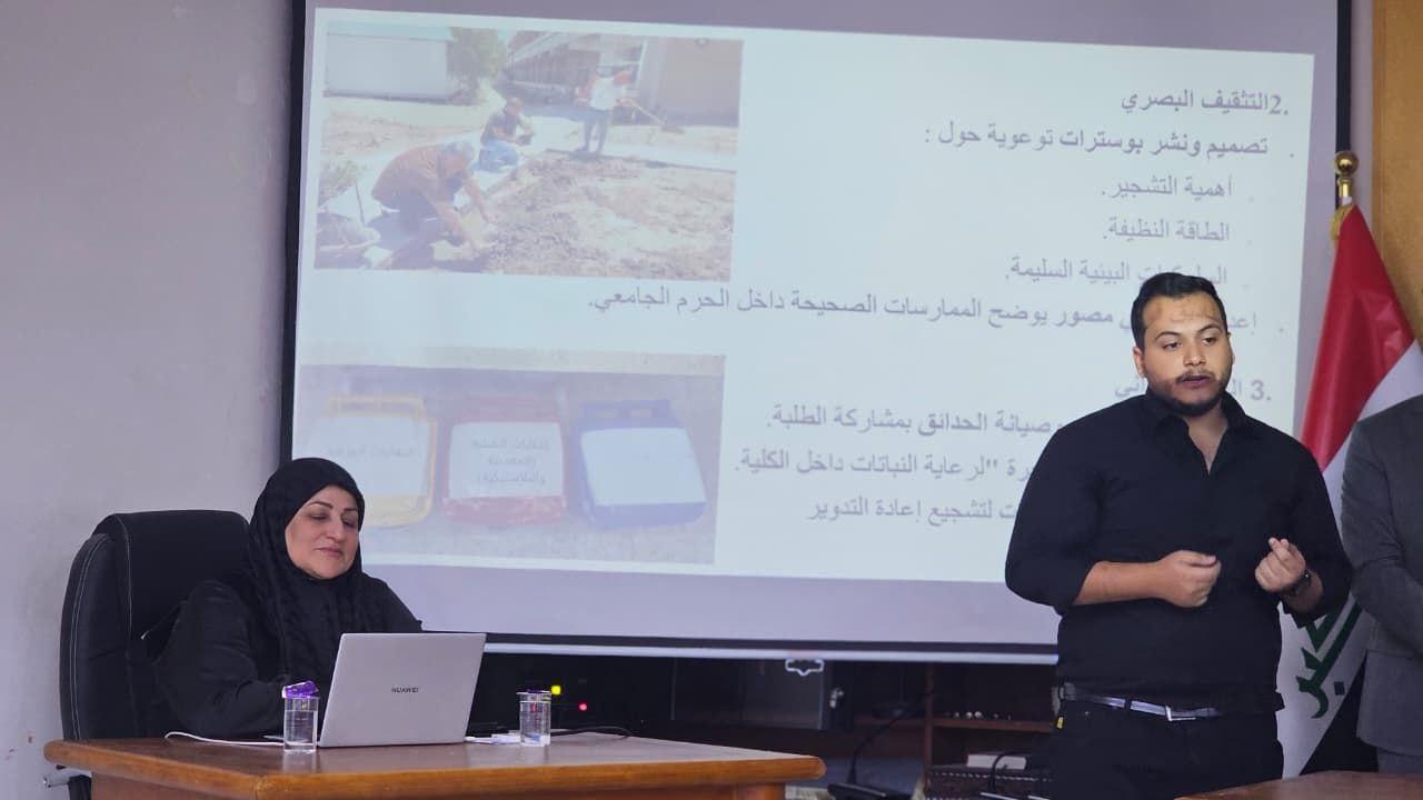 وتضمّنت الندوة التي قدمتها لجنة أصدقاء البيئة في الكلية آلية عمل اللجنة ودورها في دعم مشاريع التنمية المستدامة، وطرح الأفكار التي تسهم في تطوير البيئة الجامعية، لاسيما ما يتعلق بتوسيع المساحات الخضراء، وزيادة حملات التشجير، وإدامة مرافق الكلية وقاعاتها ومختبراتها.