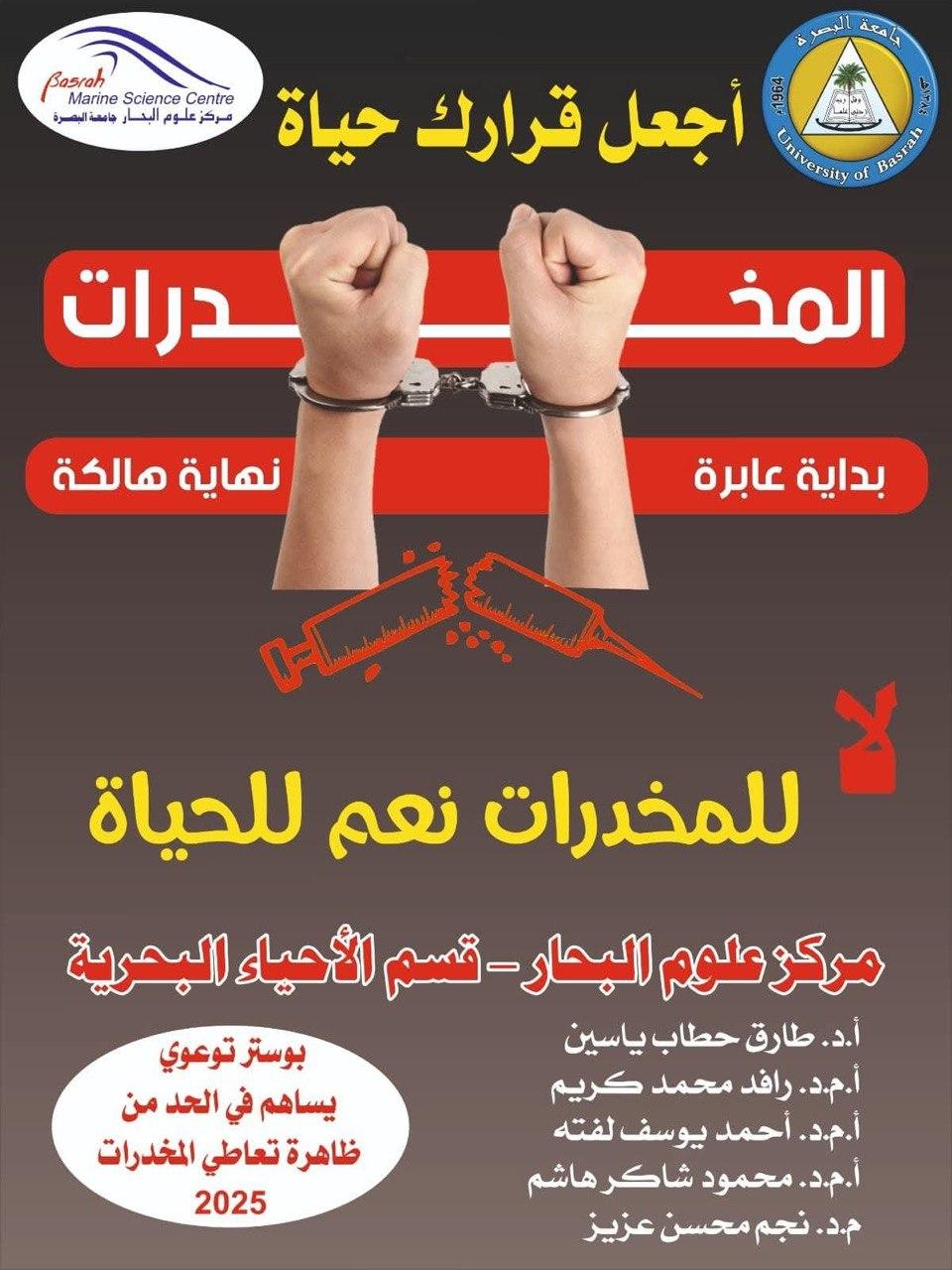 نظم مركز علوم البحار بجامعة البصرة حملة توعوية شملت لصق عدد من البوسترات الإرشادية بأروقة المركز في إطار الجهود المستمرة لنشر الوعي في المجتمع الأكاديمي والبحثي حول مخاطر المخدرات وتأثيرها السلبي على الفرد والمجتمع.